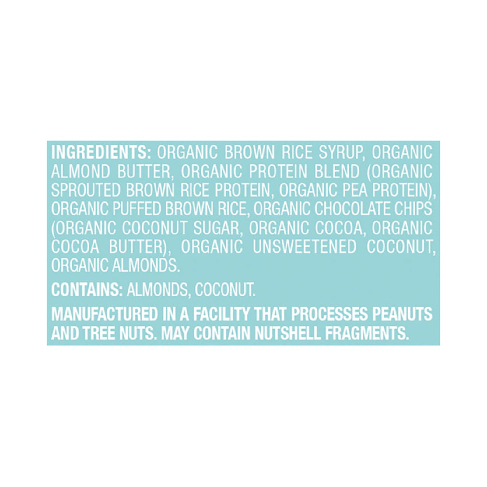 ingredients : organic brown rice syrup;organic almond butter;organic protein blend (organic sprouted brown rice protein, organic pea protein);organic puffed brown rice;organic chocolate chips (organic coconut sugar, organic cocoa, organic cocoa butter);organic unsweetened coconut;organic almonds