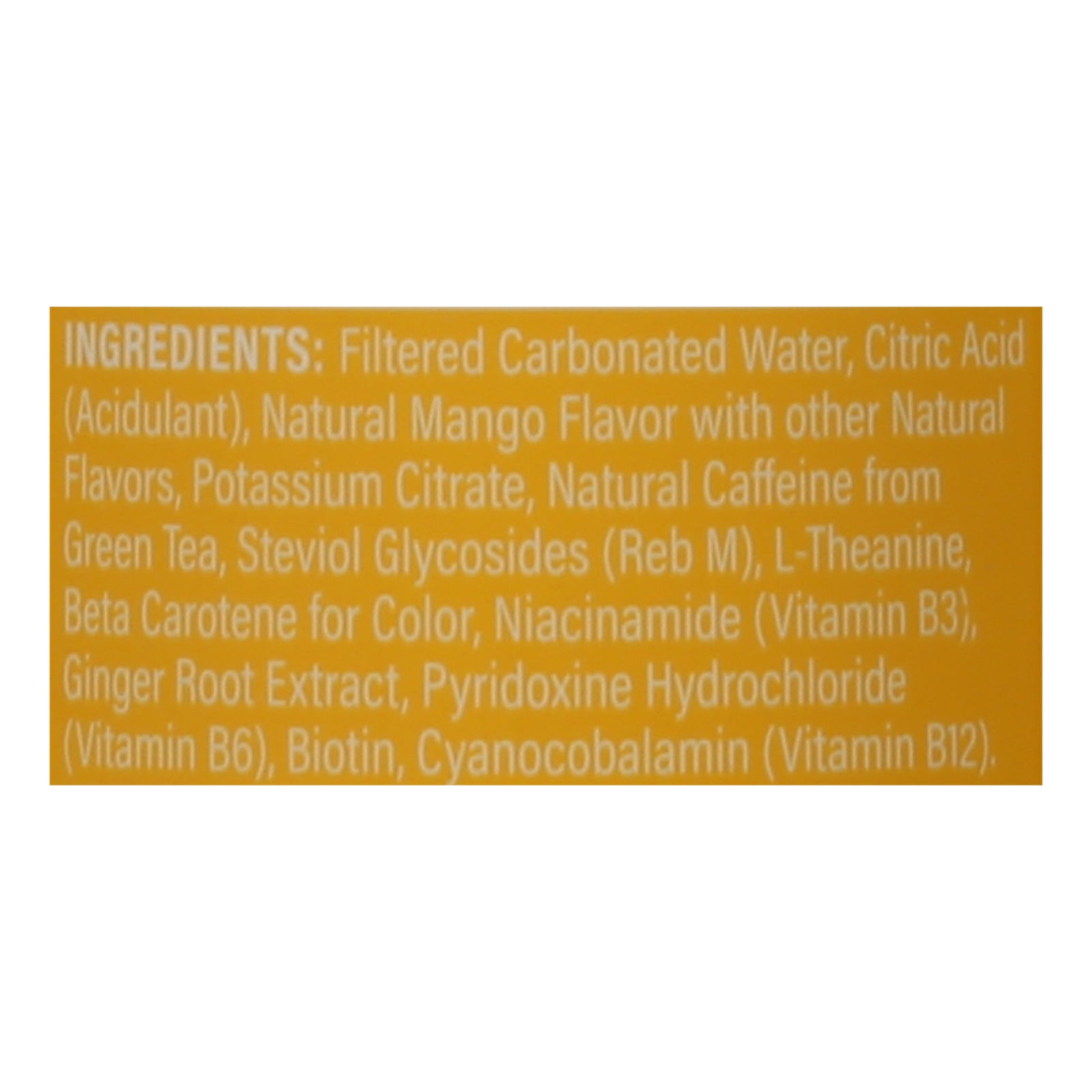 ingredients : filtered carbonated water;citric acid;natural mango flavor with other natural flavors;potassium citrate;caffeine from green tea;steviol glycosides (reb m);l-theanine;beta carotene for color;niacinamide (vitamin b3);ginger root extract;pyridoxine hydrochloride (vitamin b6);biotin;cyanocobalamin (vitamin b12)