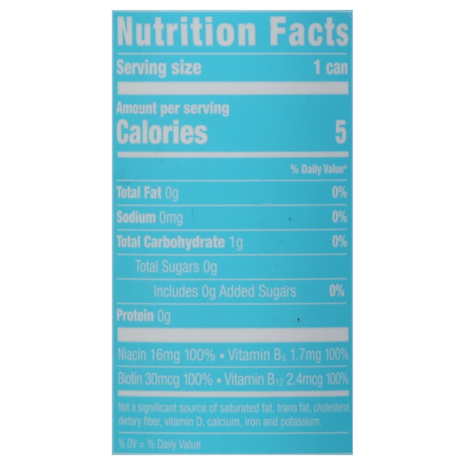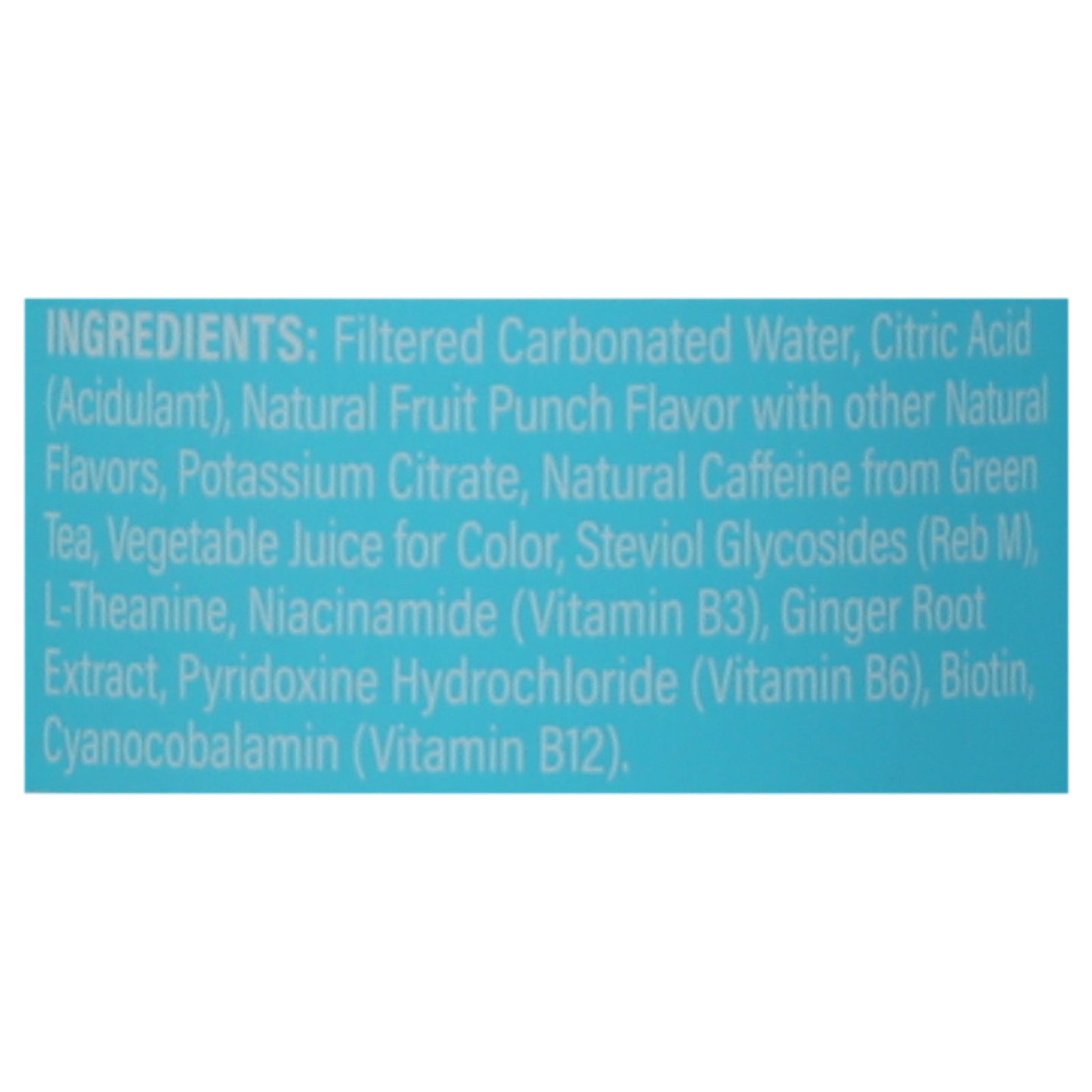 ingredients : filtered carbonated water;citric acid;natural fruit punch flavor with other natural flavors;potassium citrate;caffeine from green tea;vegetable juice for color;steviol glycosides (reb m);l-theanine;niacinamide (vitamin b3);ginger root extract;pyridoxine hydrochloride (vitamin b6);biotin;cyanocobalamin (vitamin b12)