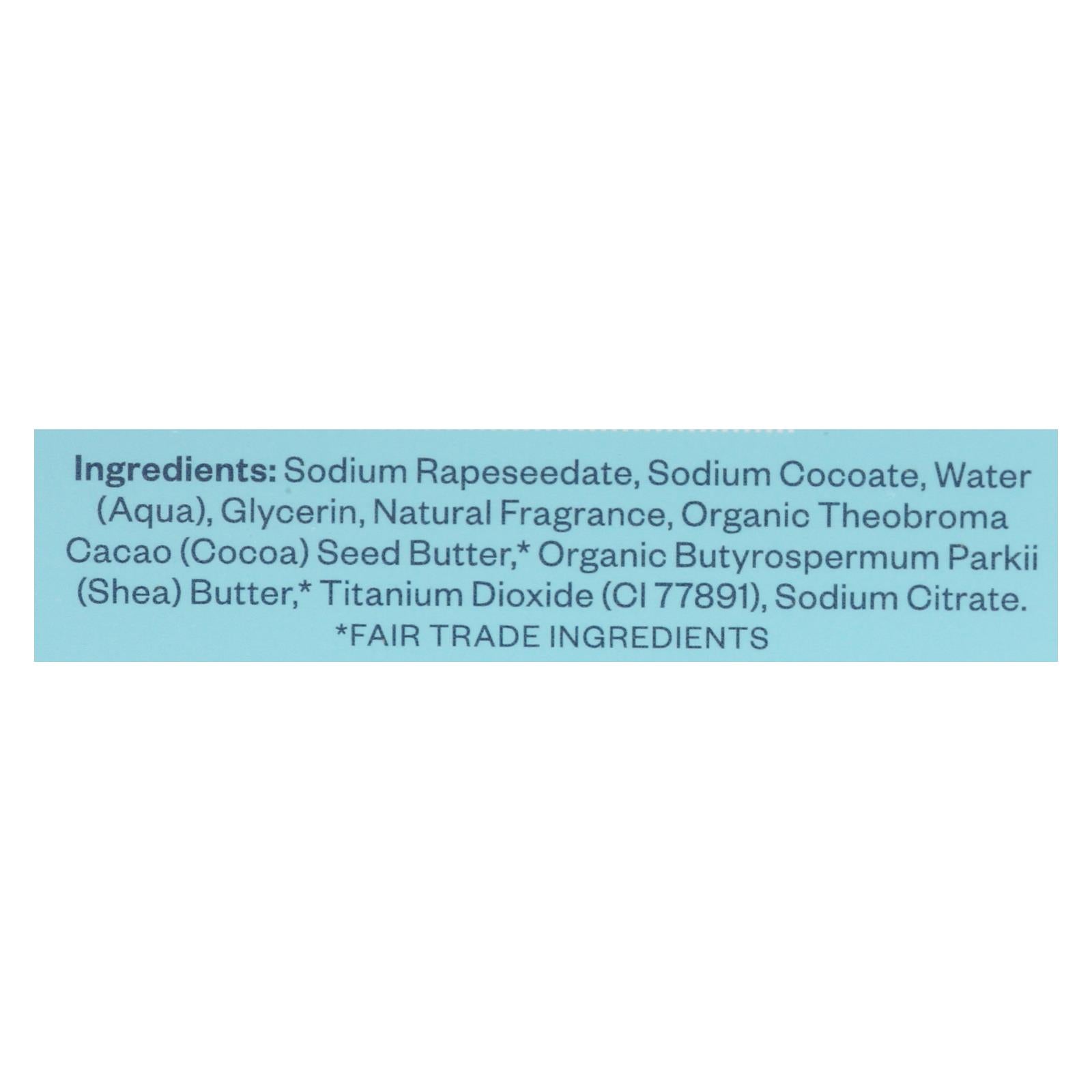 ingredients : sodium rapeseedate;sodium cocoate;water;aqua;glycerin;natural fragrance;organic theobroma cacao;cocoa;seed butter;organic butyrospermum parkii;shea;butter;titanium dioxide;ci 77891;sodium citrate