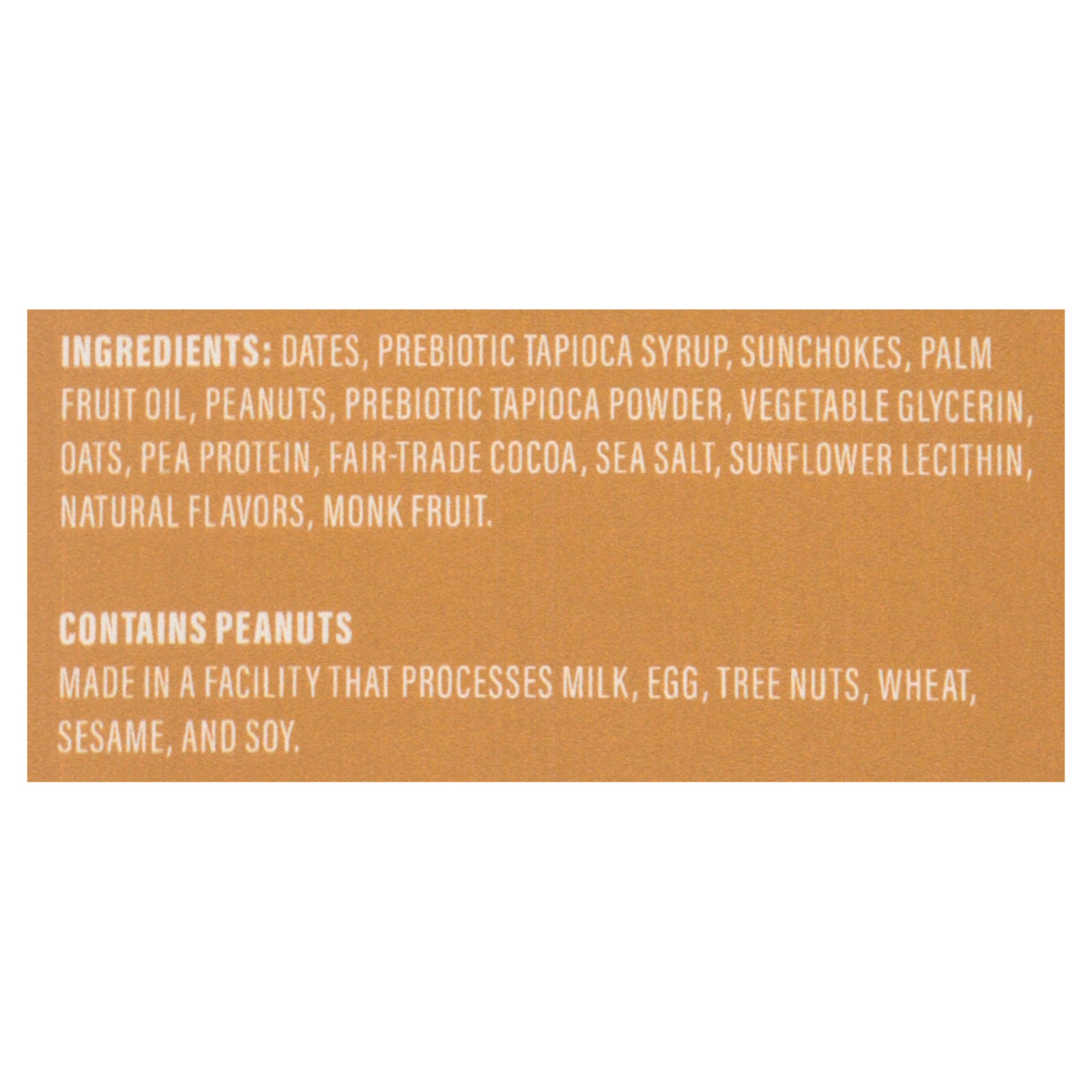 ingredients : prebiotic tapioca fiber;dates;jerusalem artichoke fiber;peanuts;palm kernel oil;oats;pea protein;vegetable glycerin;fair-trade cocoa;sunflower lecithin;salt;natural flavors;monk fruit