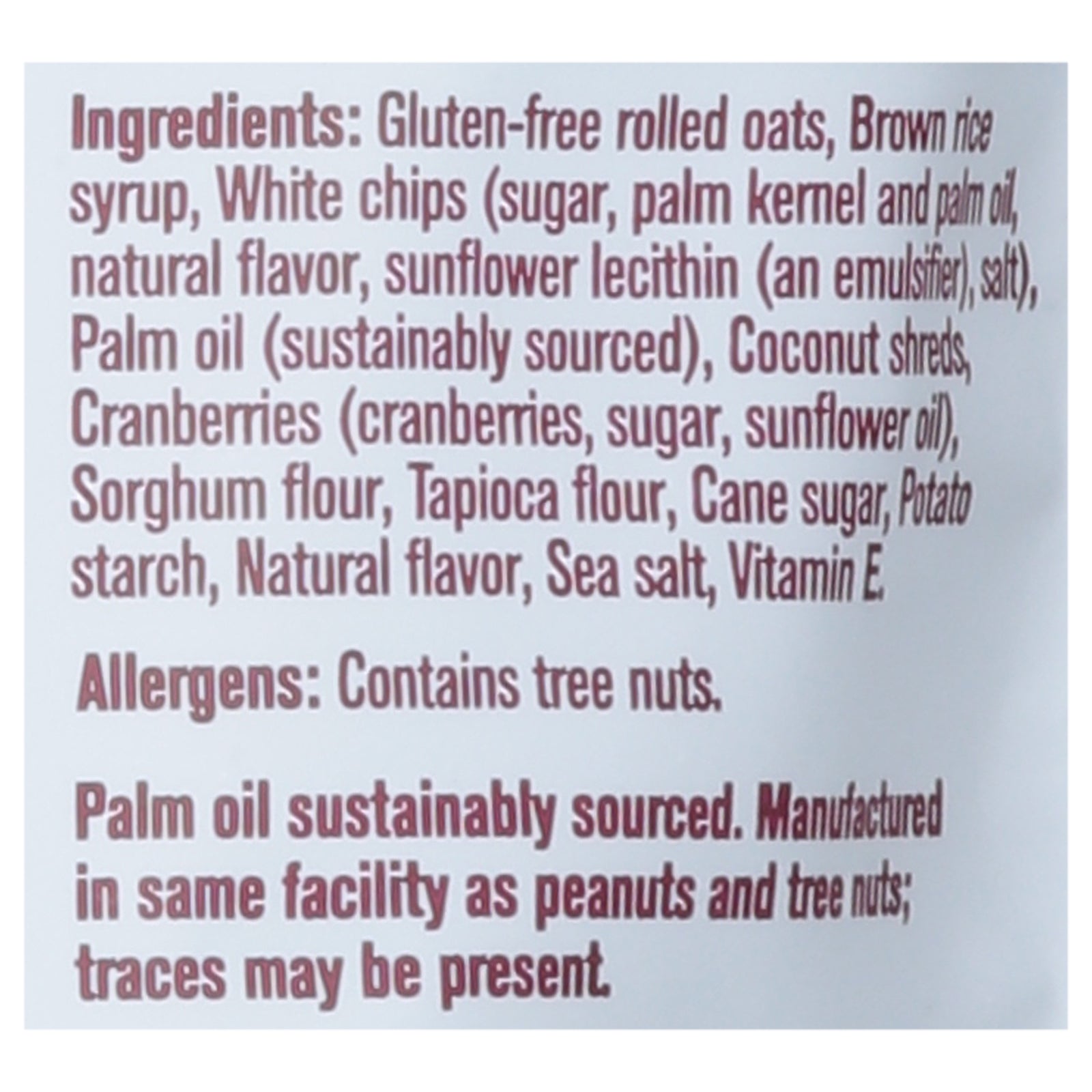 ingredients : gluten-free oats;brown rice syrup;cane sugar;palm and palm kernel oil (sustainably sourced);coconut;cranberries;sorghum flour;tapioca flour;potato starch;natural flavors;sea salt;sunflower lecithin (an emulsifier) and oil;vitamine