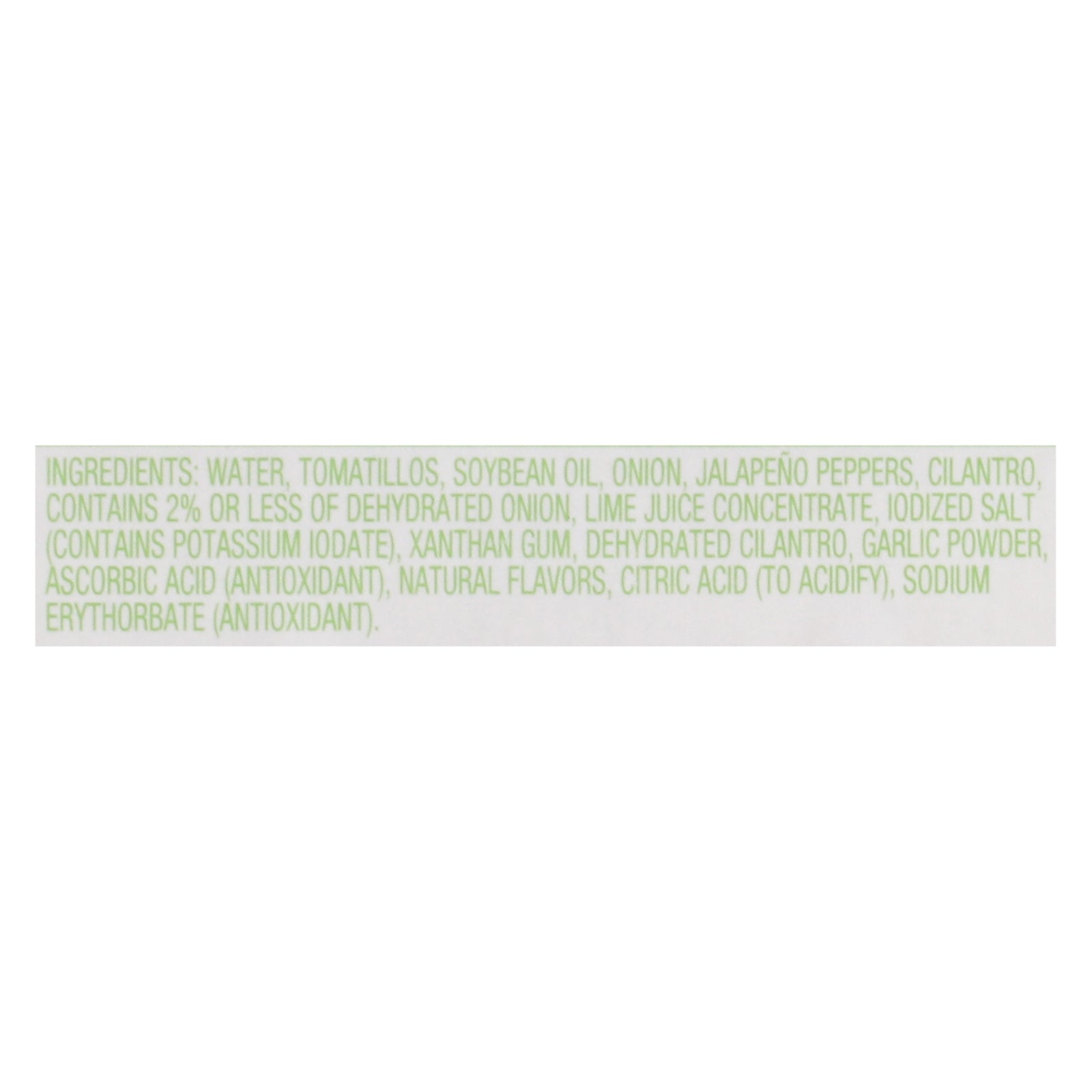 ingredients : water;tomatillos;soybean oil;onion;jalapeno peppers;cilantro;contains 2% or less of dehydrated onion;lime juice concentrate;iodized salt;contains potassium iodate;xanthan gum;dehydrated cilantro;garlic powder;ascorbic acid;antioxidant;natural flavors;citric acid;to acidify;sodium erythorbate