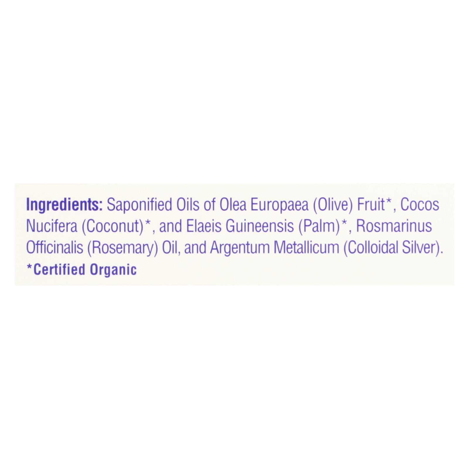 ingredients : saponified oils of olea europaea;olive;fruit;cocos nucifera;coconut;and elaeis guineensis;palm;rosmarinus officinalis;rosemary;oil;and argentum metallicum;colloidal silver