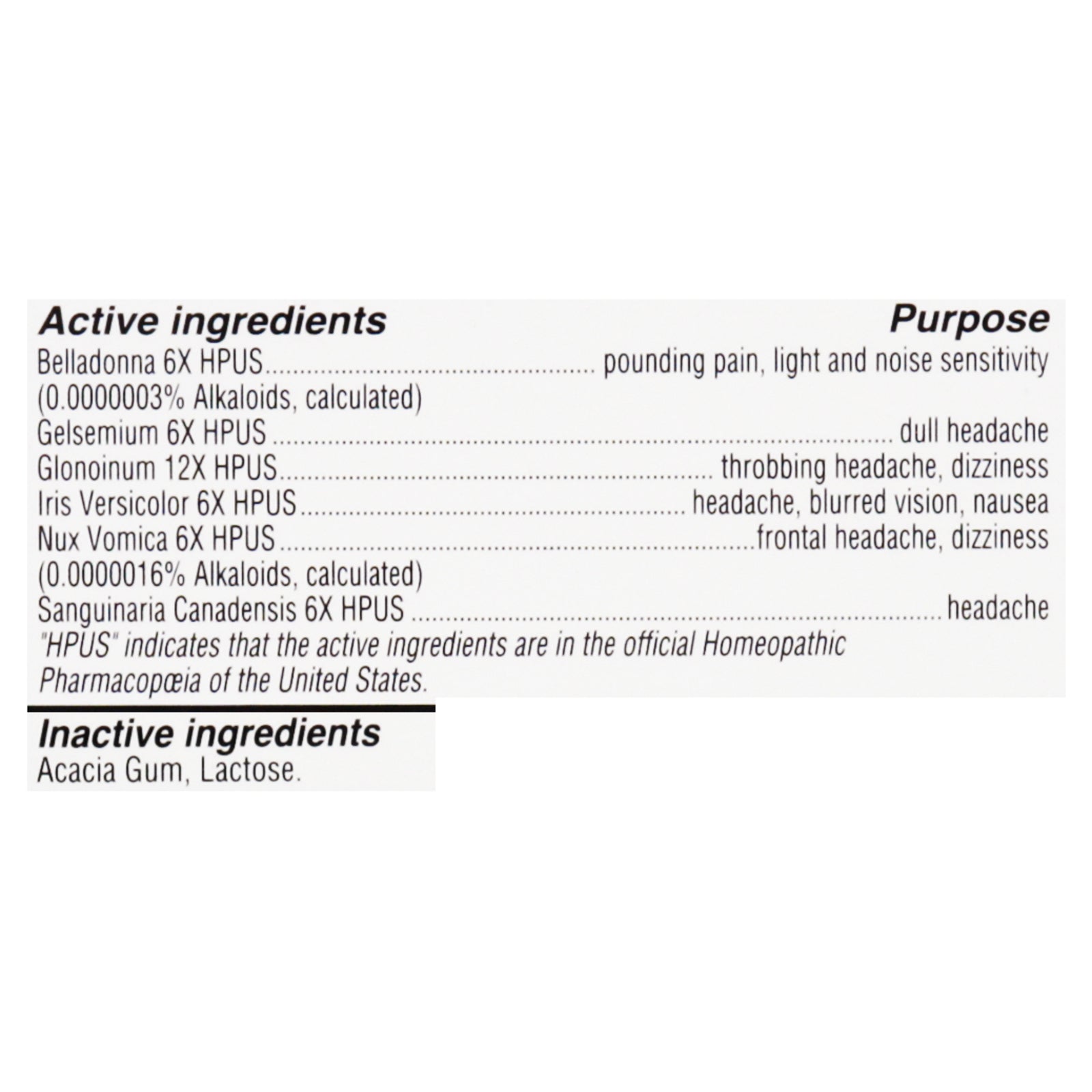 ingredients : acacia gum;lactose;belladonna 6x hpus (0.000003% alkaloids, calculated) purpose pain;light and noise sensitivity gelsemium sempervirens 6x hpus purpose dull headache glonoinum 12x hpus purpose headache;dizziness iris versicolor 6x hpus purpose blurred vision;nausea nux vomica 6x hpus (0.0000016% alkaloids, calculated) purpose frontal headache;dizziness sanguinaria canadensis 6x hpus purpose headache