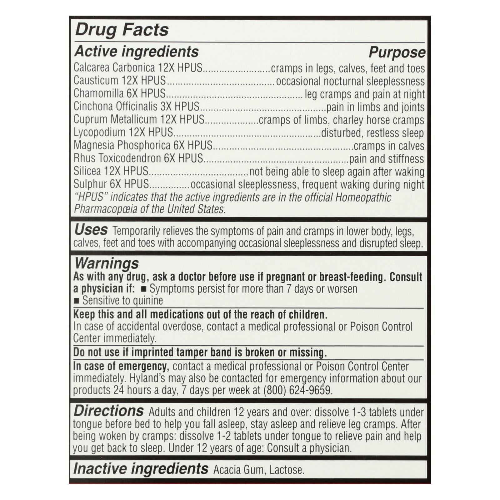 Hyland's nighttime leg cramp pm relief is designed to relieve symptoms of leg cramps, including limb and joint pain, calf and feet cramps and the sleeplessness associated with cramps. The formula is non-habit forming for your safety and health and is also quick-dissolving for convenience and ease of use. This recyclable box contains an 50 quick-dissolving leg cramp relief tablets, which should be taken before bed.