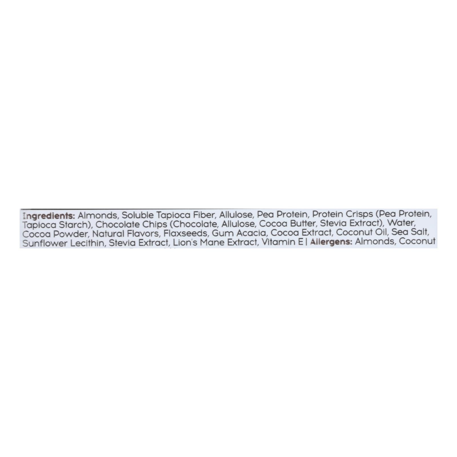ingredients : almonds;protein blend (pea protein crisps [pea protein, tapioca starch);pea protein);natural flavors;prebiotic blend (tapioca fiber, vegetable fiber);cocoa;coconut oil;unsweetened chocolate;water;cocoa butter;sea salt;lion's mane;stevia plant extract;vitamine