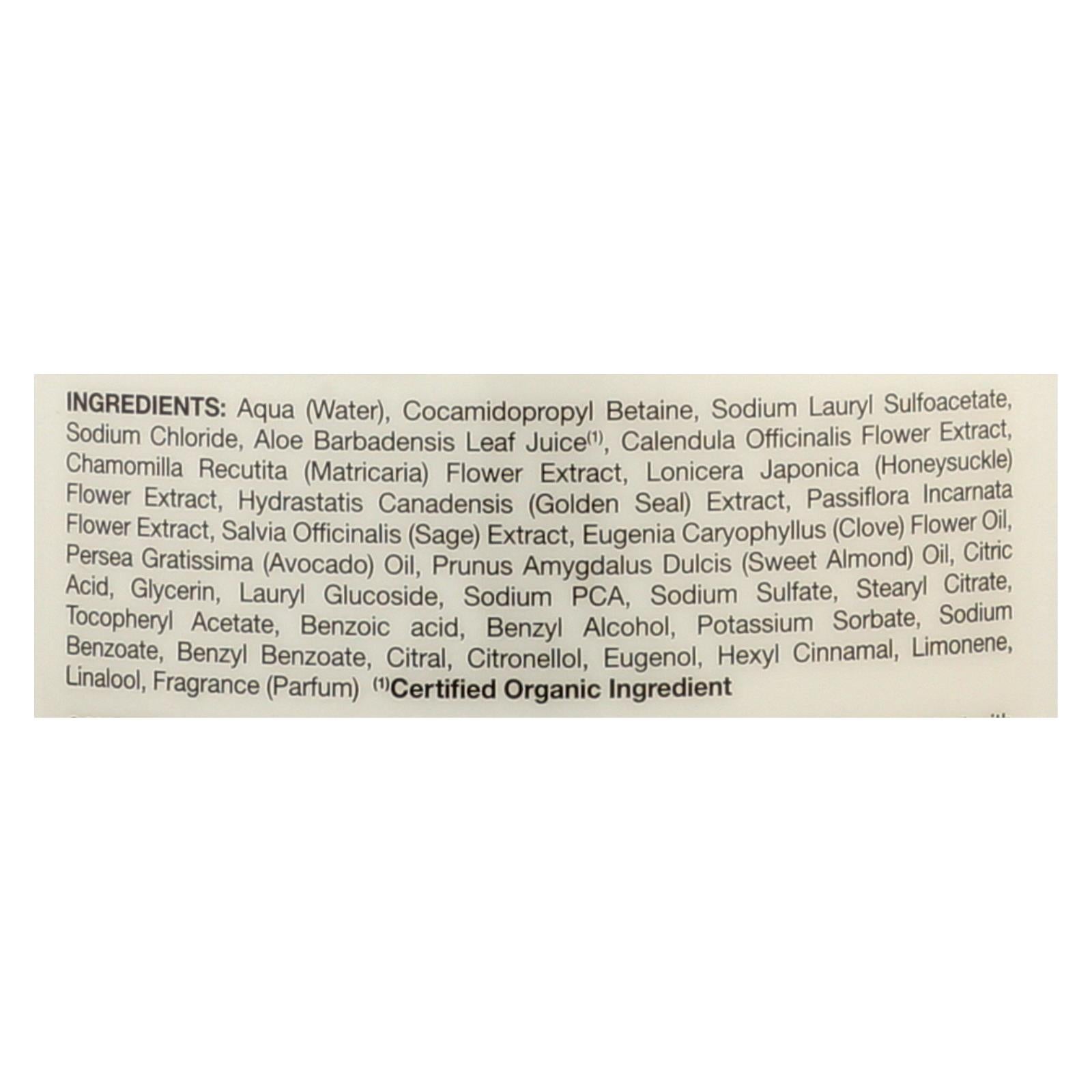 ingredients : aqua;water;cocamidopropyl betaine;sodium lauryl sulfoacetate;sodium chloride;ale barbadensis;leaf juice;¹;calendula officinalis flower extract;chamomilla recutita;matricaria;flower extract;lonicera japonica;honeysuckle;hydrastatis canadensis;golden seal;extract;passiflora incarnata flower extract;salvia officinalis;sage;eugenia caryophyllus;clove;flower oil;persea gratissima;avocado;oil;prunus amygdalus dulcis;sweet almond;citric acid;glycerin;lauryl glucoside;sodium pca;sodium sulfate;stearylc