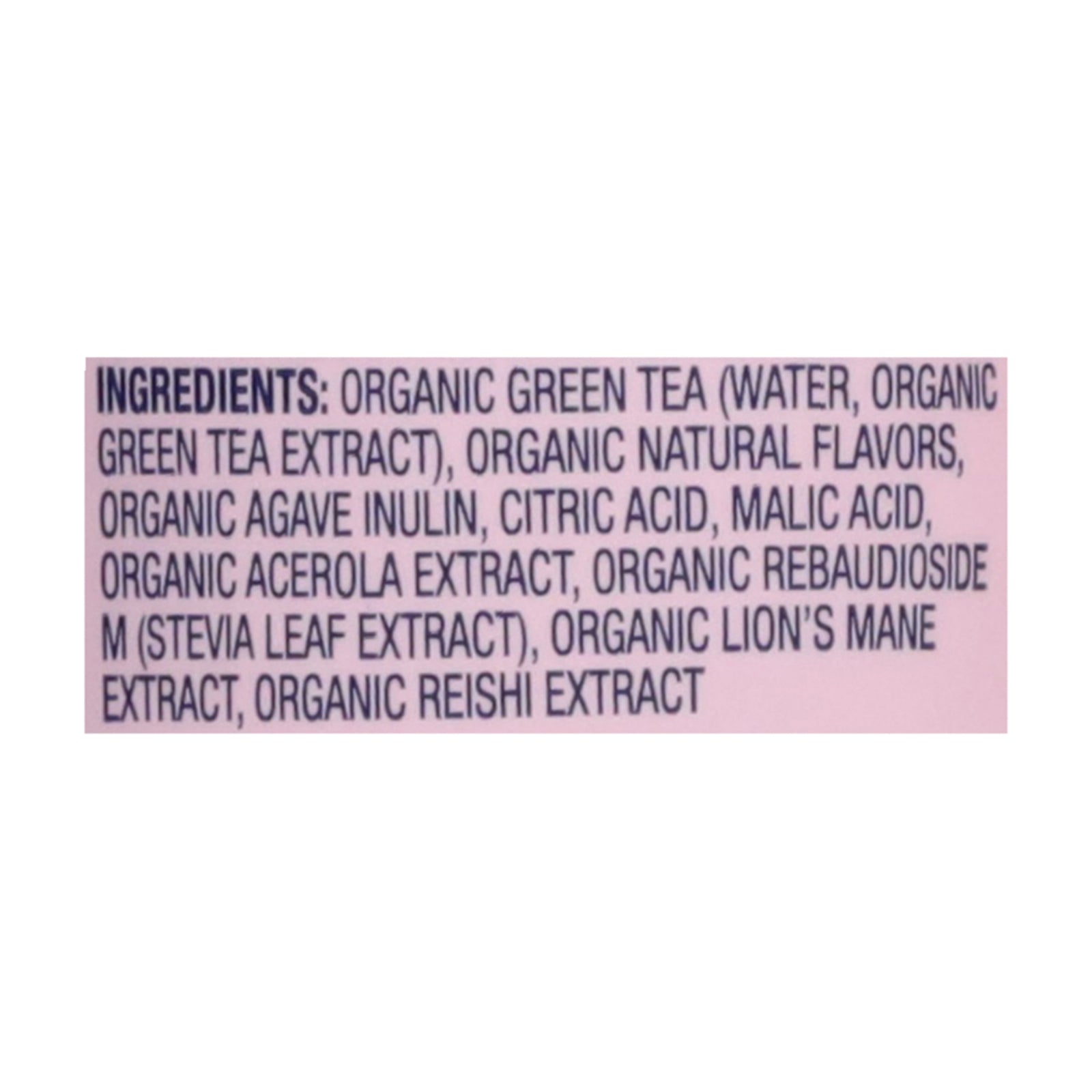 ingredients : organic green tea (water, organic green tea extract);organic natural flavors;organic agave inulin;organic citric acid;organic malic acid;organic acerola extract;organic rebaudioside m (stevia leaf extract);organic ashwagandha extract;organic lion's mane extract;organic reishi extract