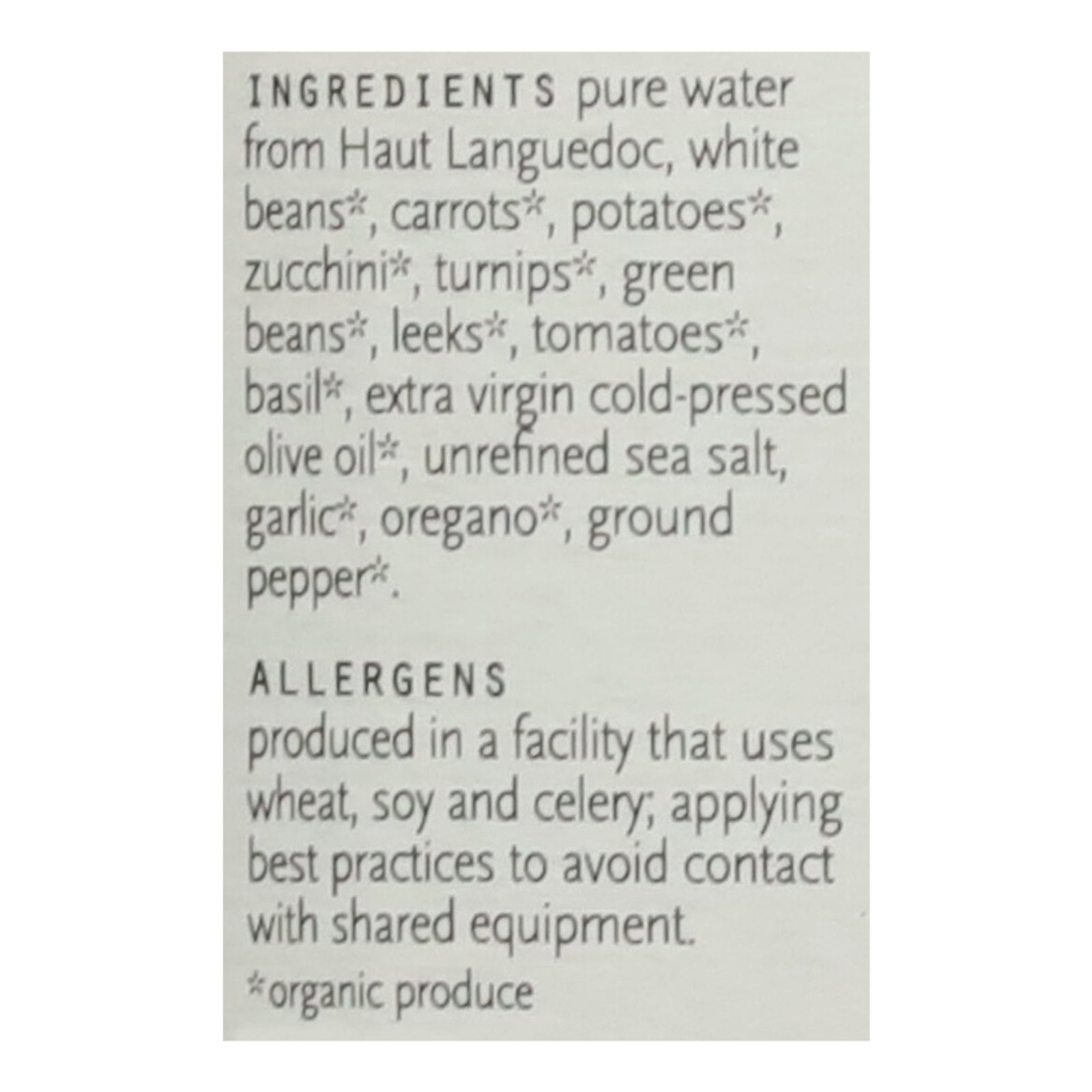 ingredients : pure water of the haut languedoc national park;white beans ;carrots ;potatoes ;zucchini ;turnips ;green beans ;leeks ;tomatoes ;basil ;extra virgin cold-pressed olive oil ;unrefined sea salt;garlic ;oregano ;ground pepper