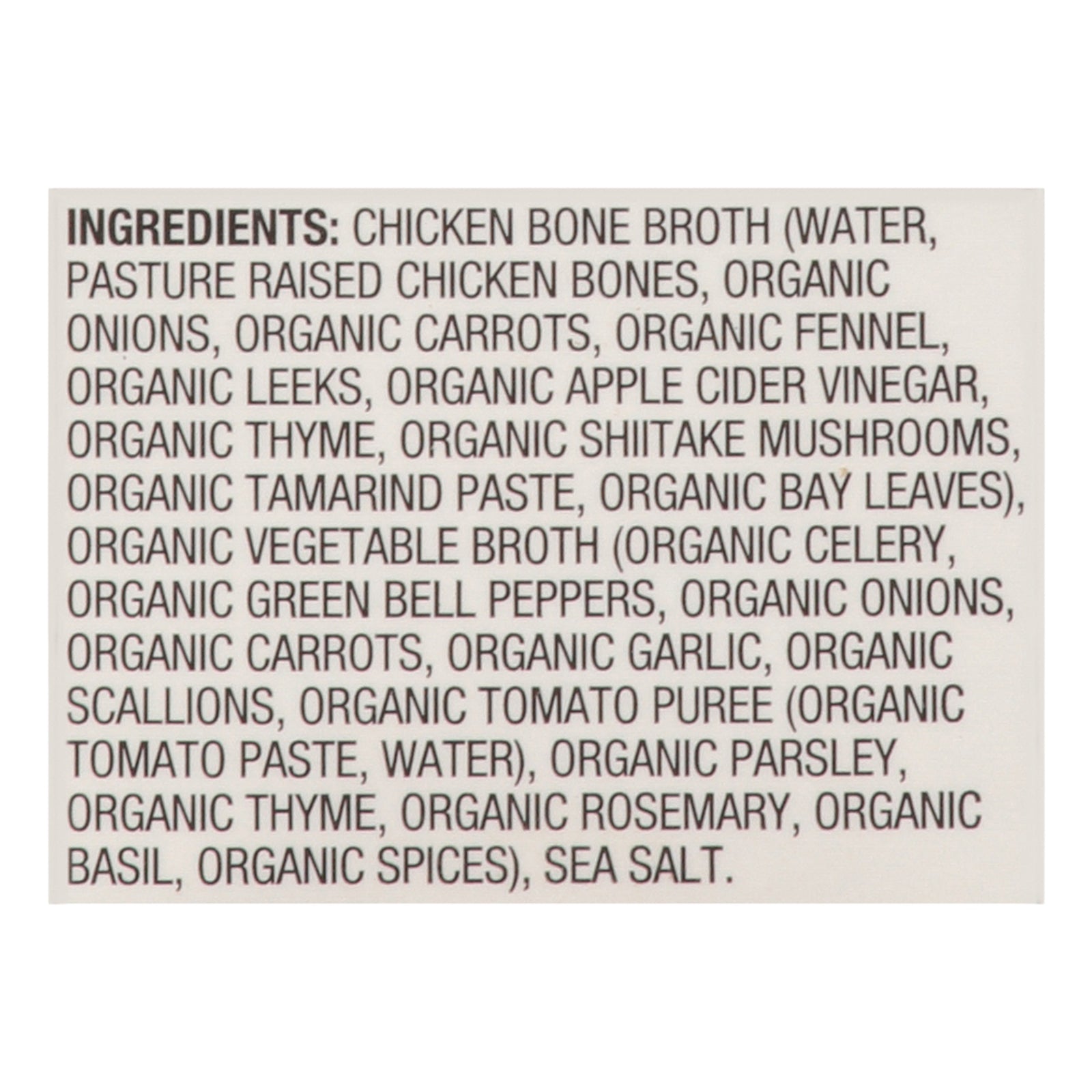 ingredients : chicken bone broth (water, pasture raised chicken bones, organic onions, organic carrots, organic fennel, organic leeks, organic apple cider vinegar, organic thyme, organic shiitake mushrooms, organic tamarind paste, organic bay leaves);organic vegetable broth (organic celery, organic green bell peppers, organic onions, organic carrots, organic garlic, organic scallions, organic tomato puree (organic tomato paste, water), organic parsley, organic thyme, organic rosemary, organic basil, organics