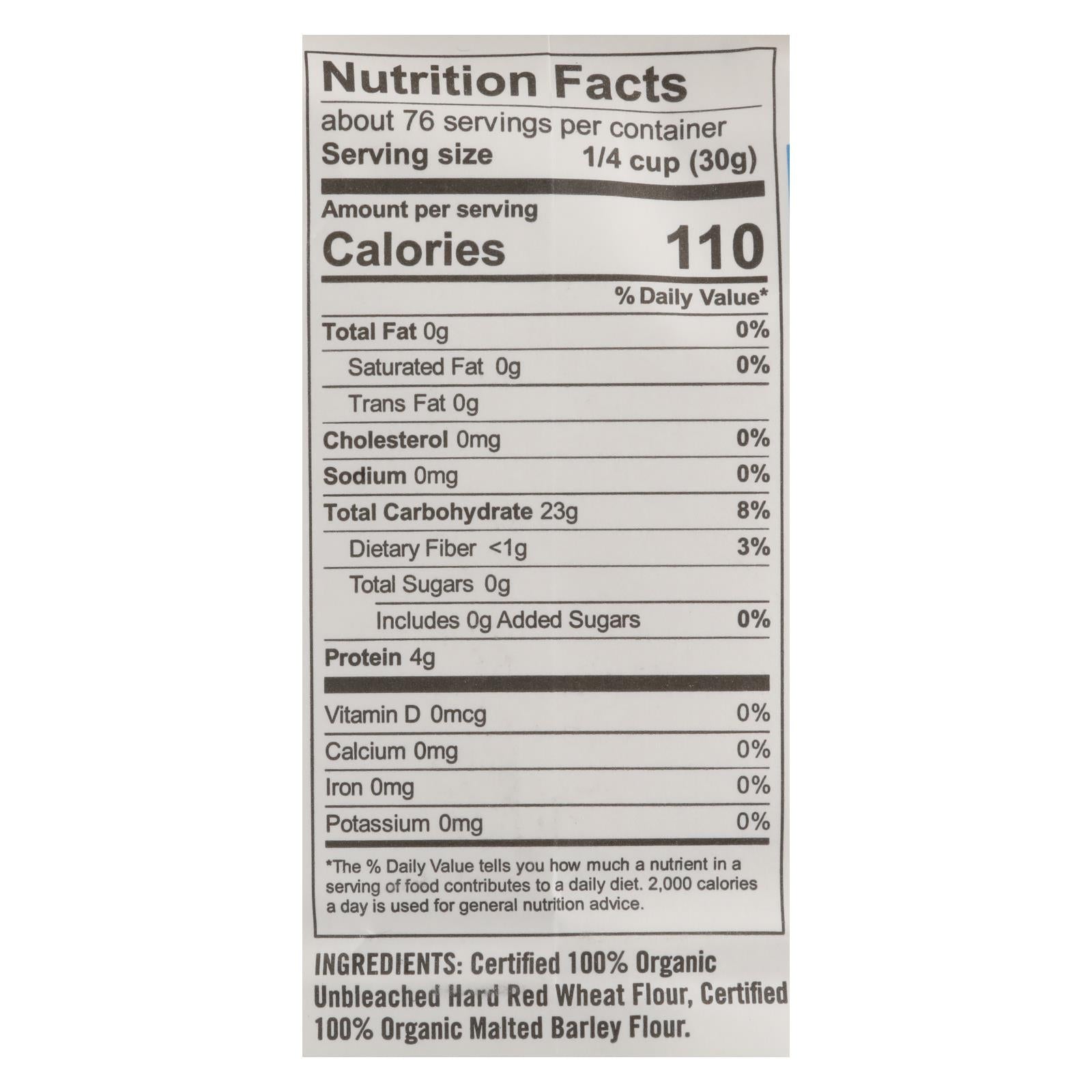 ingredients : certified 100% organic unbleached hard red wheat flour;certified 100% organic malted barley flour