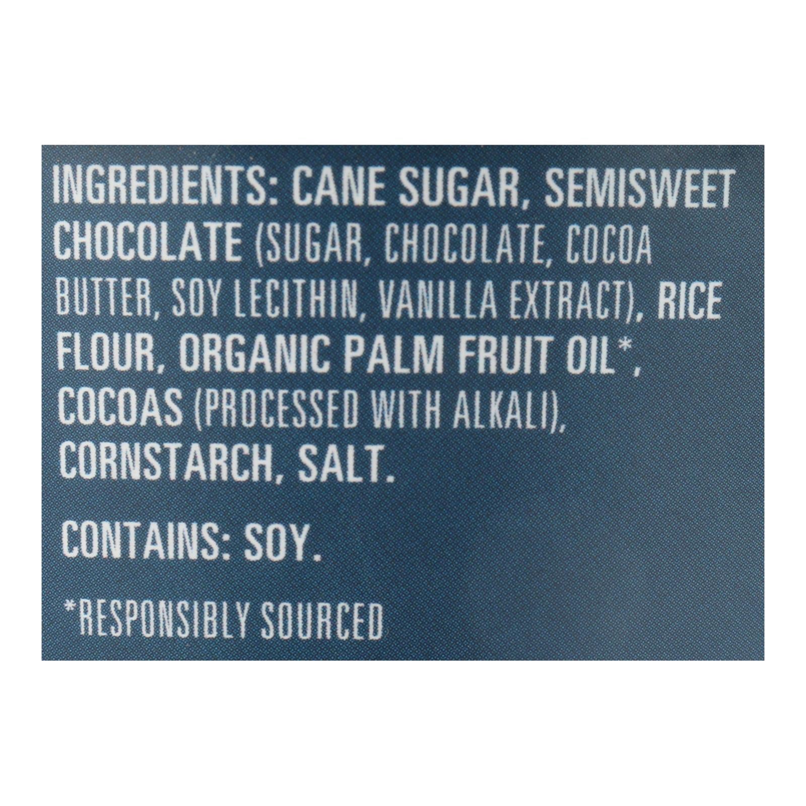 ingredients : cane sugar;semisweet chocolate (sugar, chocolate, cocoa butter, soy lecithin, vanilla extract);rice flour;organic palm fruit oil;cocoas (processed with alkali);cornstarch;salt