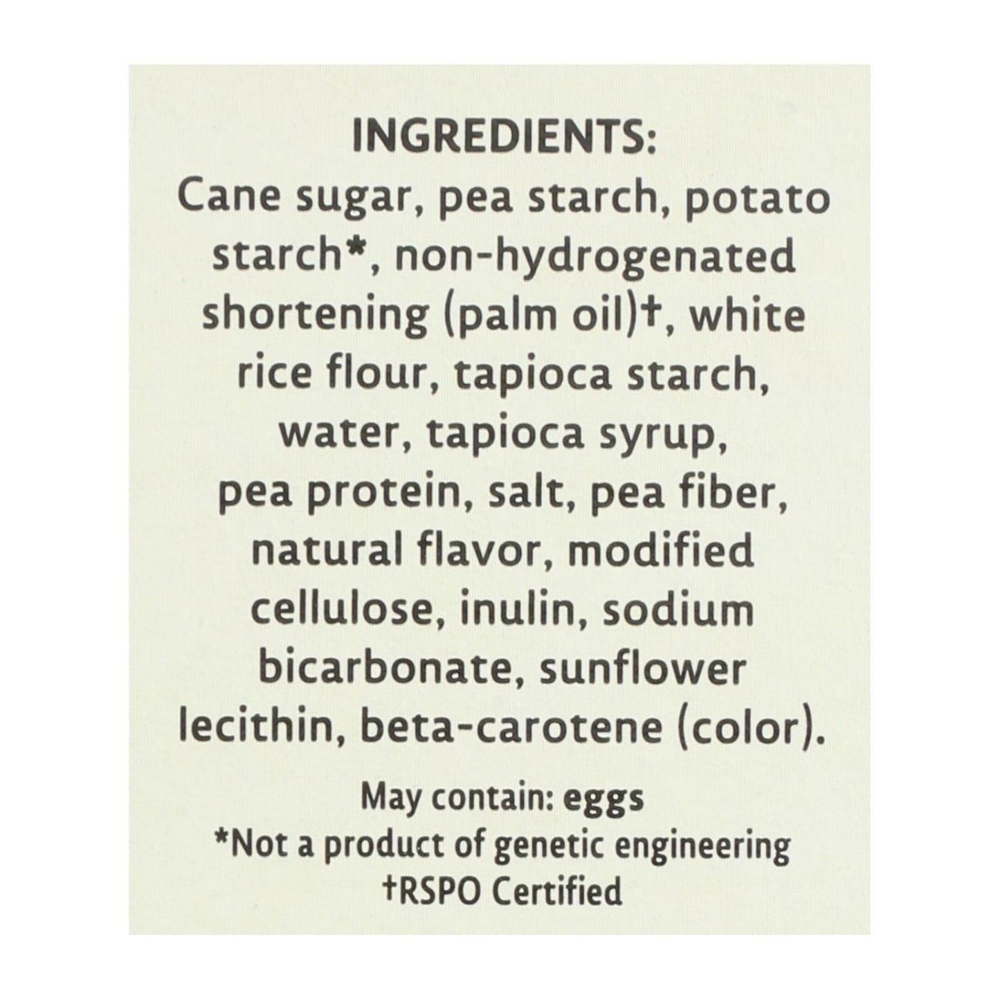 ingredients : cane sugar;pea starch;potato starch;non-hydrogenated shortening;palm oil;†;white rice flour;tapioca starch;water;tapioca syrup;pea protein;salt;pea fiber;natural flavor;modified cellulose;inulin;sodium bicarbonate;sunflower lecithin;beta-carotene;color