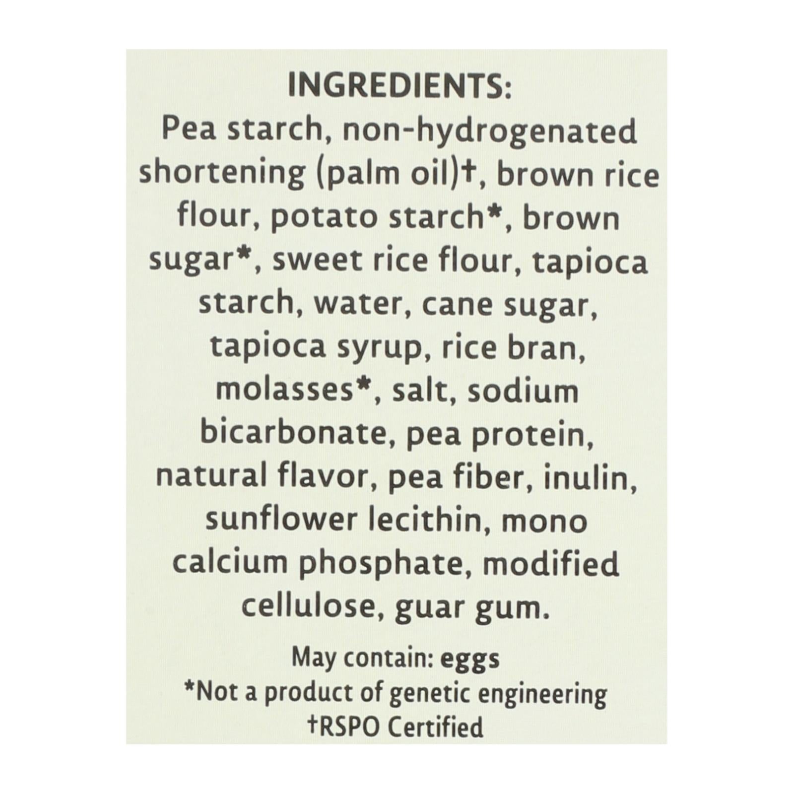 ingredients : pea starch;non-dehydrated shortening;palm oil;†;brown rice flour;potato starch;brown sugar;sweet rice flour;tapioca starch;water;cane sugar;tapioca syrup;rice bran;molasses;salt;sodium bicarbonate;pea protein;natural flavor;pea fiber;inulin;sunflower lecithin;mono calcium phosphate;modified cellulose;guar gum