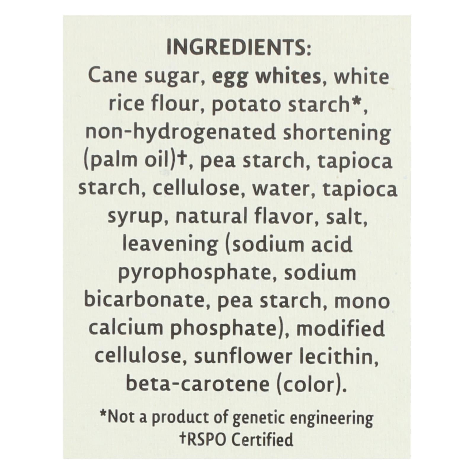 ingredients : cane sugar;egg whites;white rice flour;potato starch;non-hydrogenated shortening (palm oil)†;pea starch;tapioca starch;cellulose;water;tapioca syrup;natural flavors;salt;leavening (sodium acid pyrophosphate, sodium bicarbonate, pea starch, mono calcium phosphate);modified cellulose;sunflower lecithin;beta-carotene (color)