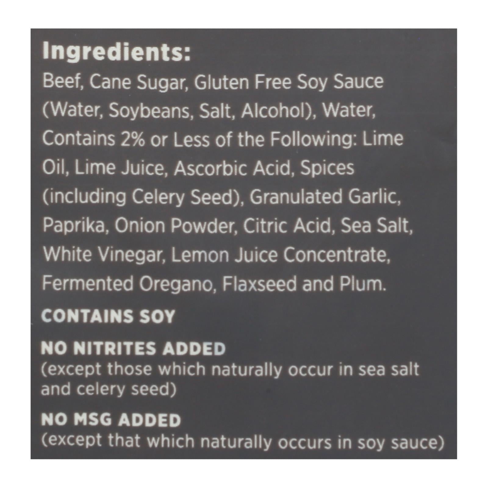 ingredients : beef;cane sugar;gluten free soy sauce;water;soybeans;salt;alcohol;soy sauce powder;soy;natural flavorings;sea salt;spices;contains 2% or less of the following: lime oil;lime juice;citric acid;ascorbic acid;white vinegar;including celery seed;paprika;granulated garlic;onion powder;lemon juice concentrate