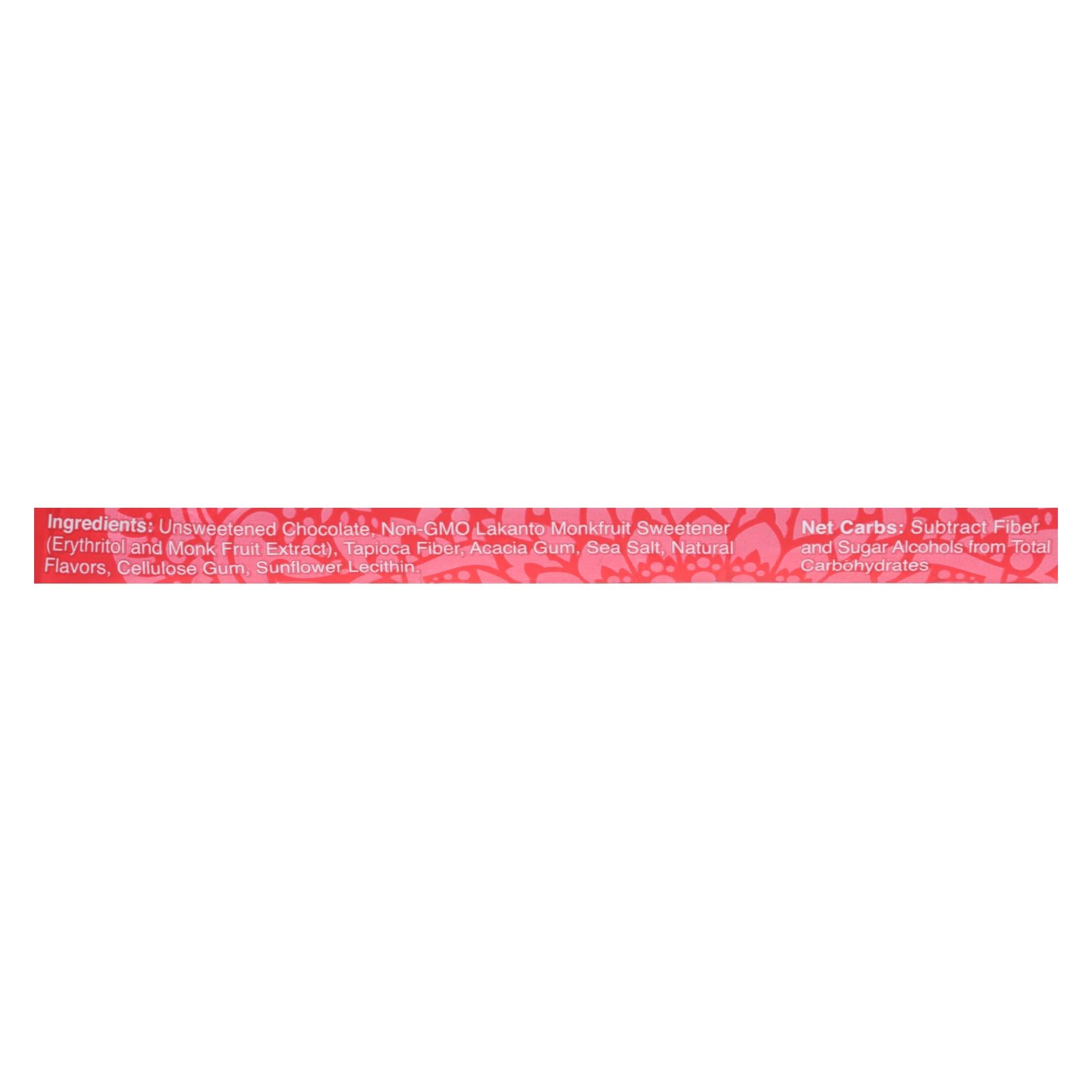 ingredients : chocolate liquor;non-gmo lakanto monkfruit sweetener (erythritol and monk fruit extract);tapioca fiber;cocoa butter;sunflower lecithin;sea salt;natural flavors