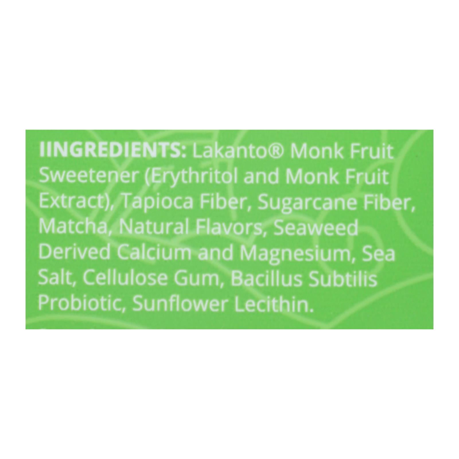 ingredients : monkfruit sweetener (erythritol, monk fruit extract);tapioca fiber;sugarcane fiber;matcha green tea;natural flavors;seaweed derived calcium;sea salt;cellulose gum;bacillus subtilis probiotic;sunflower lecithin
