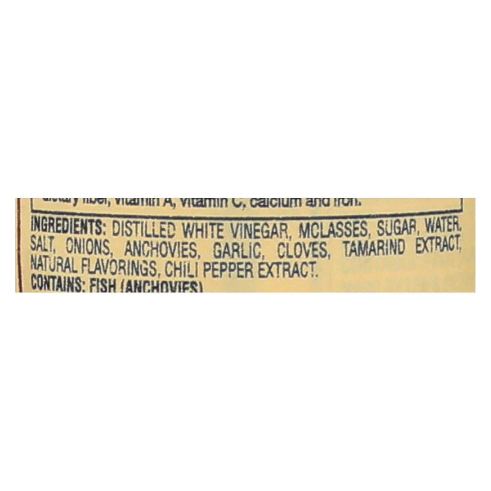 ingredients : distilled white vinegar;molasses;sugar;water;salt;onions;anchovies;garlic;cloves;tamarind extract;natural flavorings;chili pepper extract