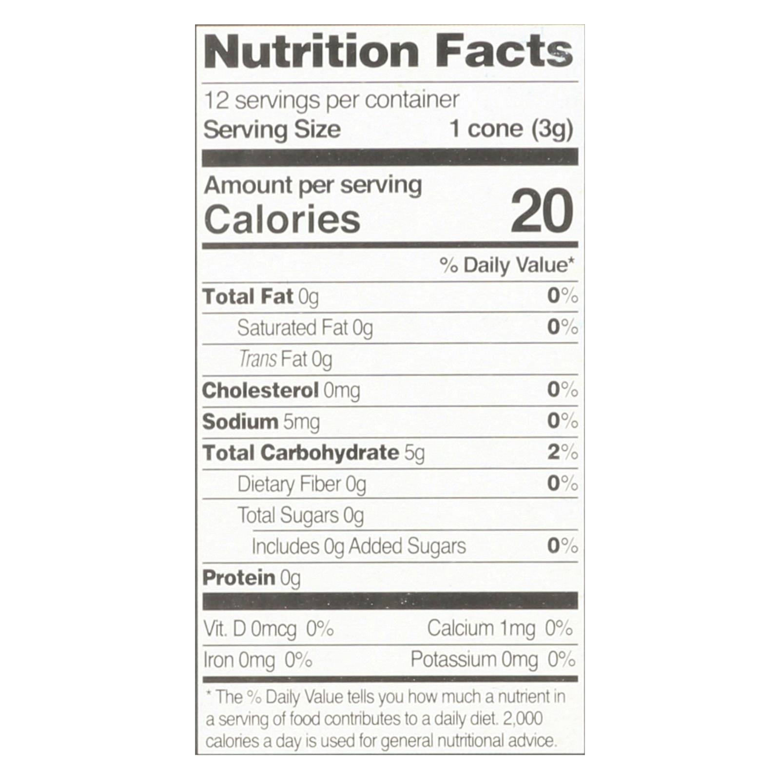 Let's do… traditional style cake ice cream cones uses ingredients that are non-gmo project verified and orthodox union kosher certified. Our cones are vegan friendly and gluten-free. Included in each 1.2 oz. Box are 12 traditional style cake ice cream cones. Each cone is 20 calories and only has 5 g. Of carbohydrates.