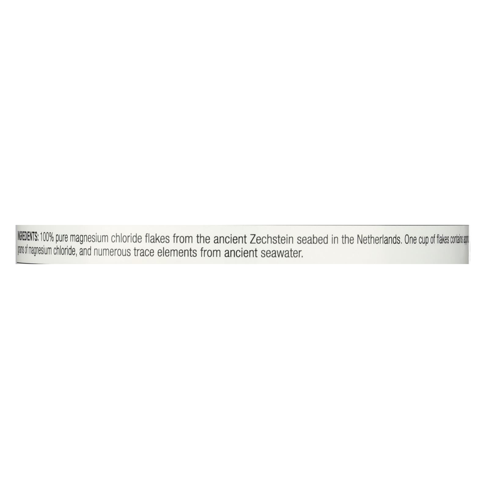 ingredients : 100% pure magnesium chloride flakes from the ancient zechstein seabed in the netherlands. One cup of flakes contains approximately 51 grams of magnesium chloride;and numerous trace elements from ancient seawater