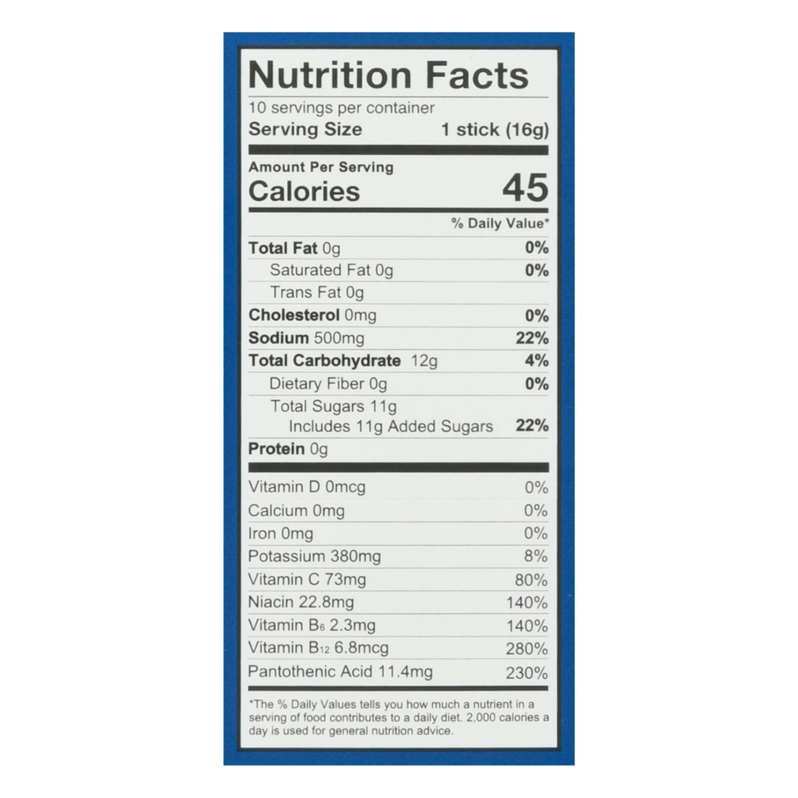 ingredients : pure cane sugar;dextrose;citric acid;salt;potassium citrate;sodium citrate;natural flavor;dipotassium phosphate;silicon dioxide;rebaudioside-a (stevia leaf extract);vitamin c (ascorbic acid);vitamin b3 (niacinamide);vitamin b5 (d-calcium pantothenate);vitamin b6 (pyridoxine hydrochloride);vitamin b12 (cyanocobalamin)