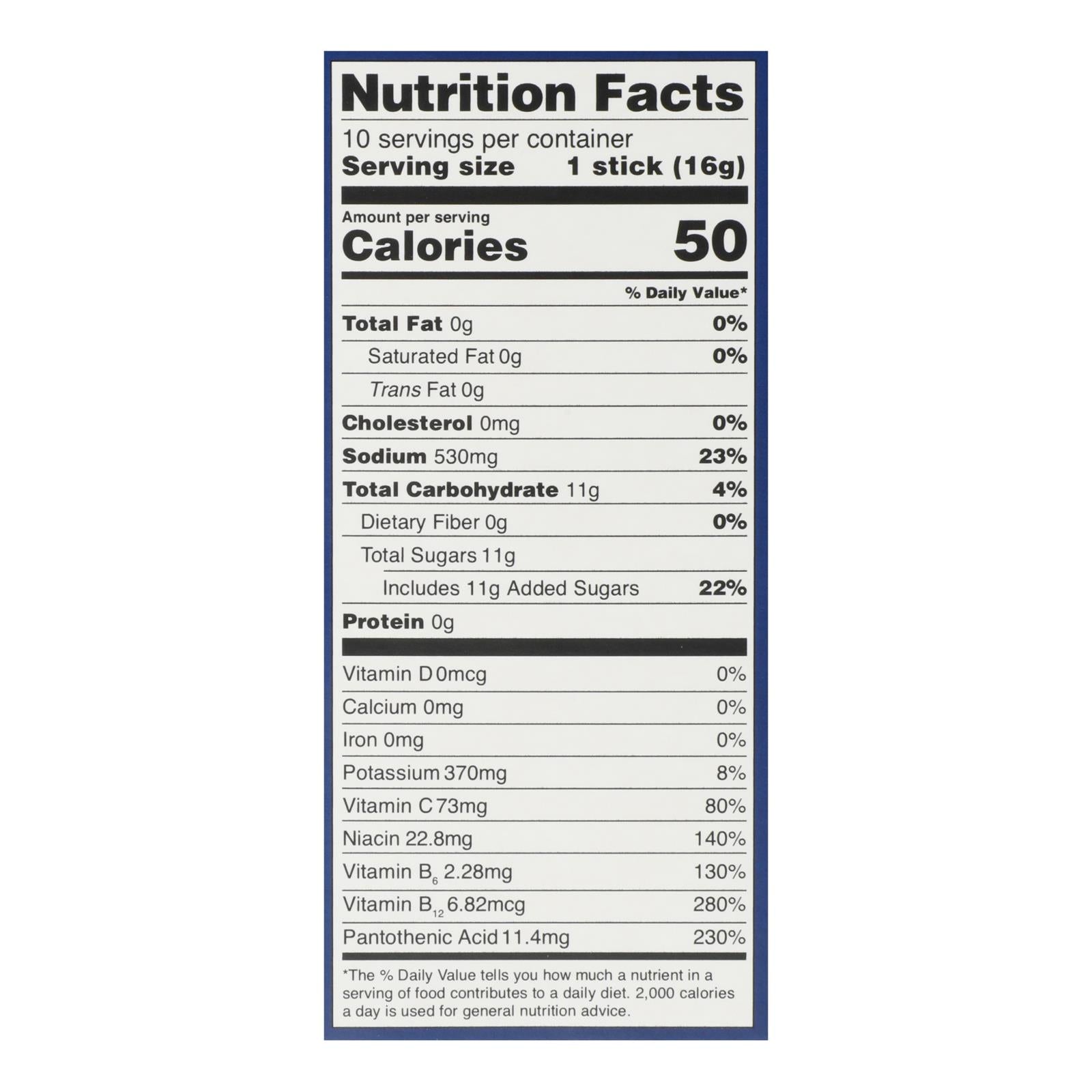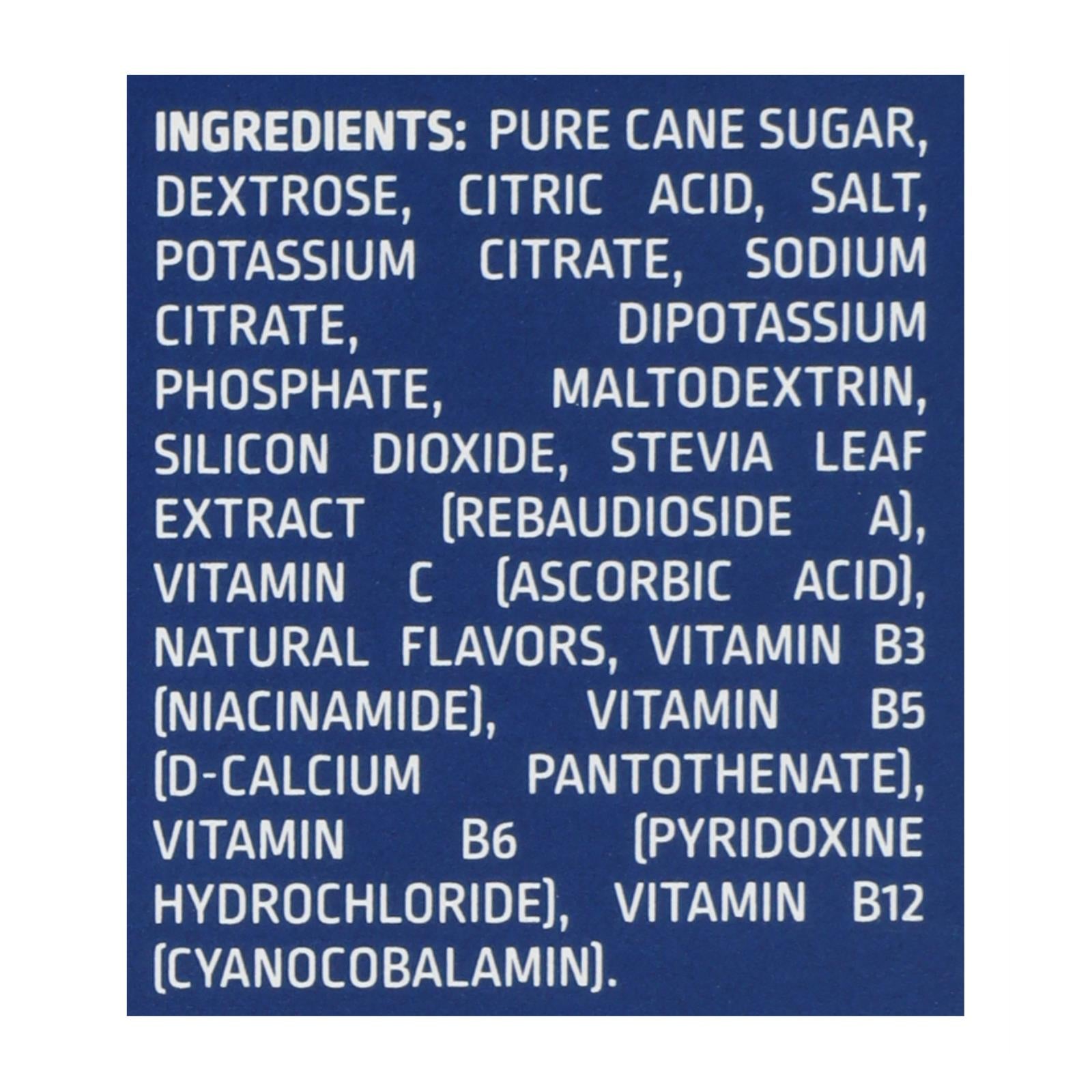 ingredients : pure cane sugar;dextrose;citric acid;salt;potassium citrate;sodium citrate;dipotassium phosphate;maltodextrin;silicon dioxide;stevia leaf extract (rebaudioside a);vitamin c (ascorbic acid);natural flavors;vitamin b3 (niacinamide);vitamin b5 (d-calcium pantothenate);vitamin b6 (pyridoxine hydrochloride);vitamin b12 (cyanocobalamin)