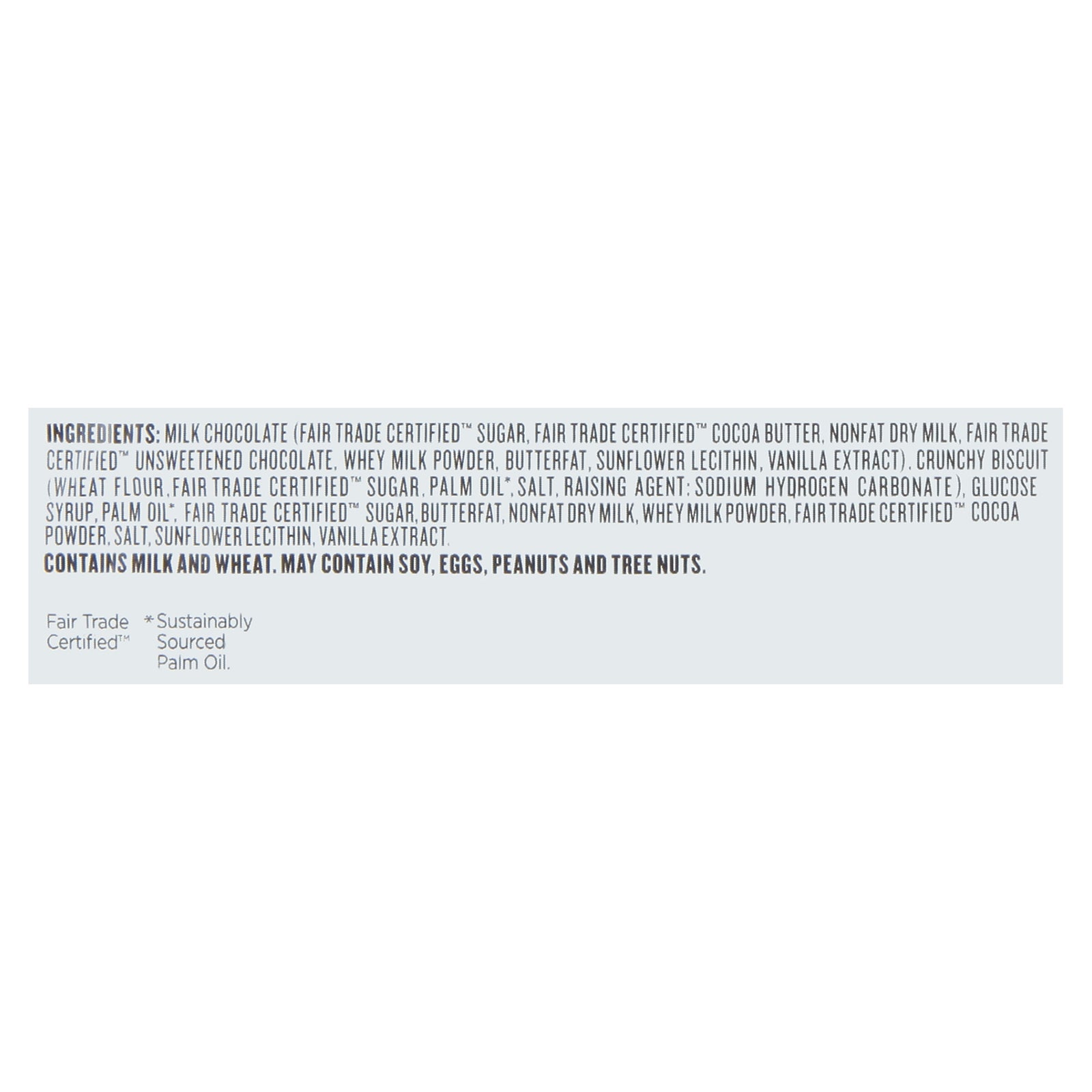 ingredients : milk chocolate (fair trade certified sugar, fair trade certified cocoa butter, nonfat dry milk, fair trade certified unsweetened chocolate, whey milk powder, butterfat, canola lecithin, vanilla extract);crunchy biscuit (wheat flour, fair trade certified sugar, palm oil , salt, baking soda);glucose syrup;palm oil ;fair trade certified sugar;butterfat;nonfat dry milk;whey milk powder;fair trade certified cocoa powder;salt;canola lecithin;vanilla extract