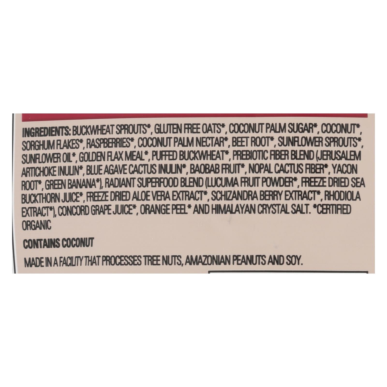 ingredients : buckwheat sprouts;gluten free oats;coconut palm sugar;coconuts;sorghum flakes;raspberries;coconut palm nectar;beet root;sunflower sprouts;sunflower oil;golden flax meal;puffed buckwheat;prebiotic fiber blend;jerusalem artichoke inulin;blue agave cactus inulin;baobab fruit;nopal cactus fiber;yacon root;green banana;radiant superfood blend;lucuma fruit powder;freeze dried sea buckthorn juice;freeze dried aloe vera extract;schizandra berry extract;rhodiola extract;concord grape juice;orange peel* a