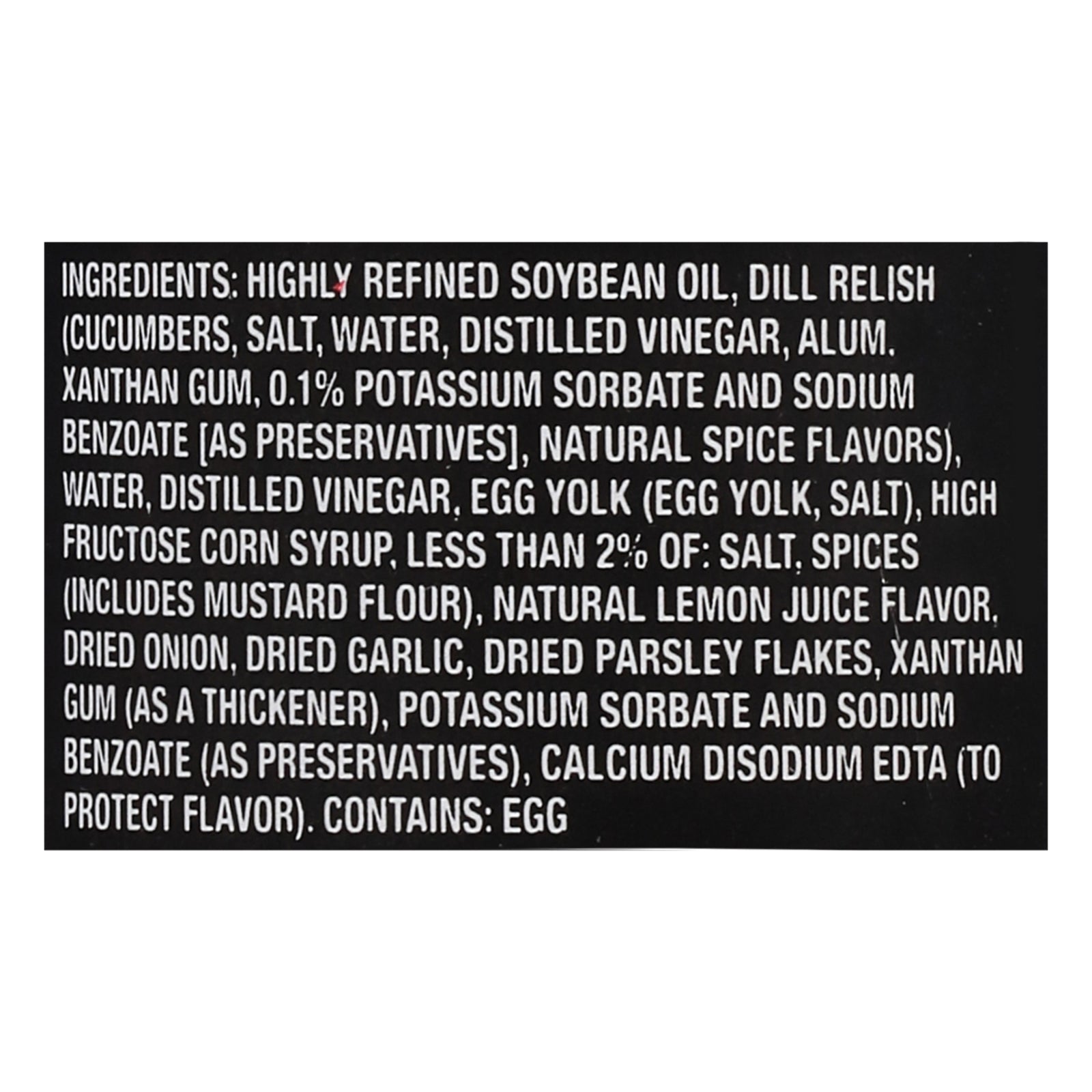 ingredients : soybean oil;chopped pickles;cucumbers;salt;water;distilled vinegar;alum;xanthan gum;0.1% potassium sorbate and sodium benzoate as preservatives;natural spice flavors;egg yolk;natural flavor;high fructose corn syrup;spices;dried onion;dried garlic;dried parsley flakes;potassium sorbate as a preservative;calcium disodium edta;to protect flavor;less than 0.1% sodium benzoate as a preservative