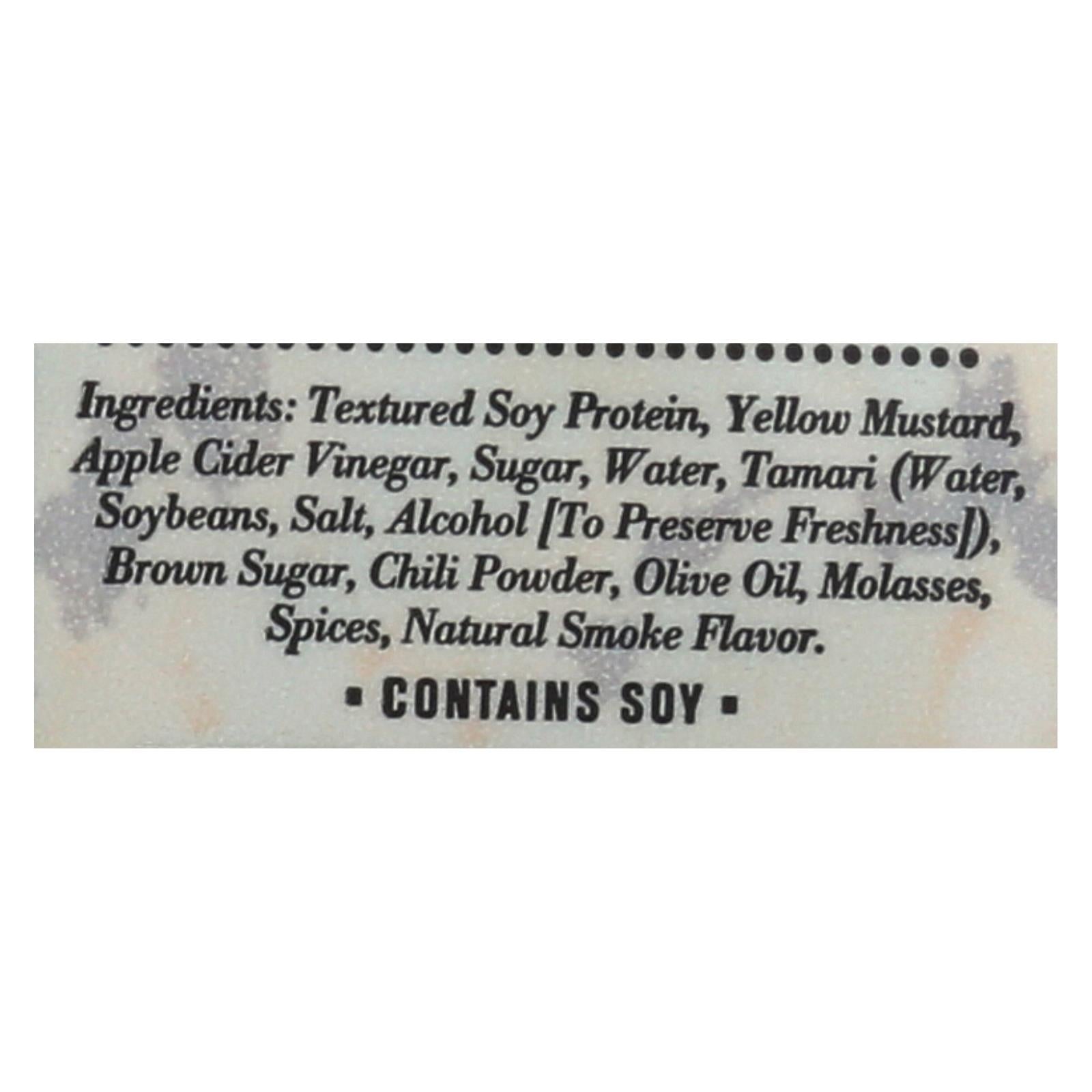 ingredients : textured soy protein;whole bean;yellow mustard;apple cider vinegar;vegan sugar;tamari;water;soybeans;salt;alcohol [to preserve freshness];vegan brown sugar;olive oil;spices;natural smoke flavor