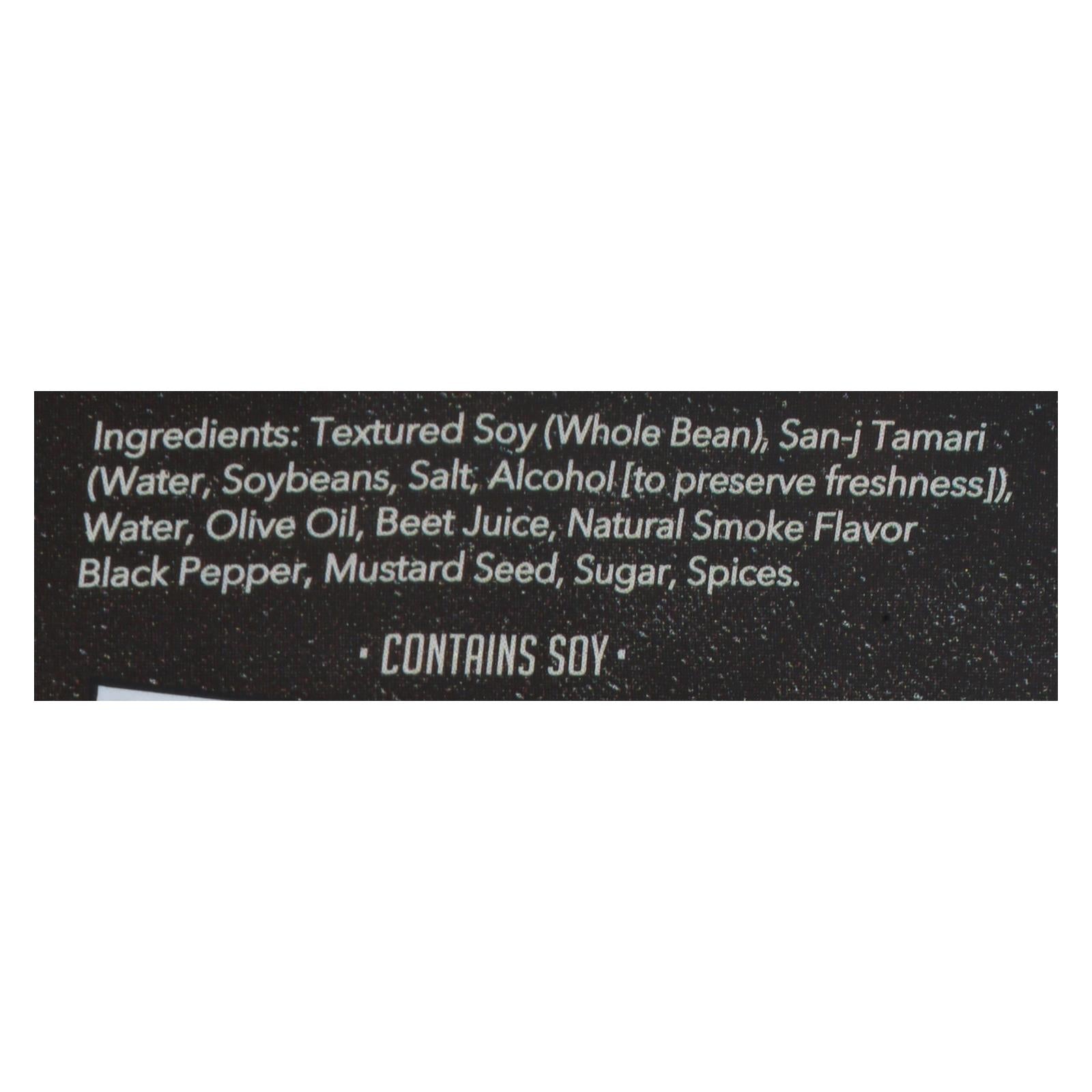 ingredients : textured soy protein (whole bean);tamari (water, soybeans, salt, alcohol [to preserve freshness]);olive oil;beet juice;natural smoke flavor;mustard seed;vegan sugar;spices
