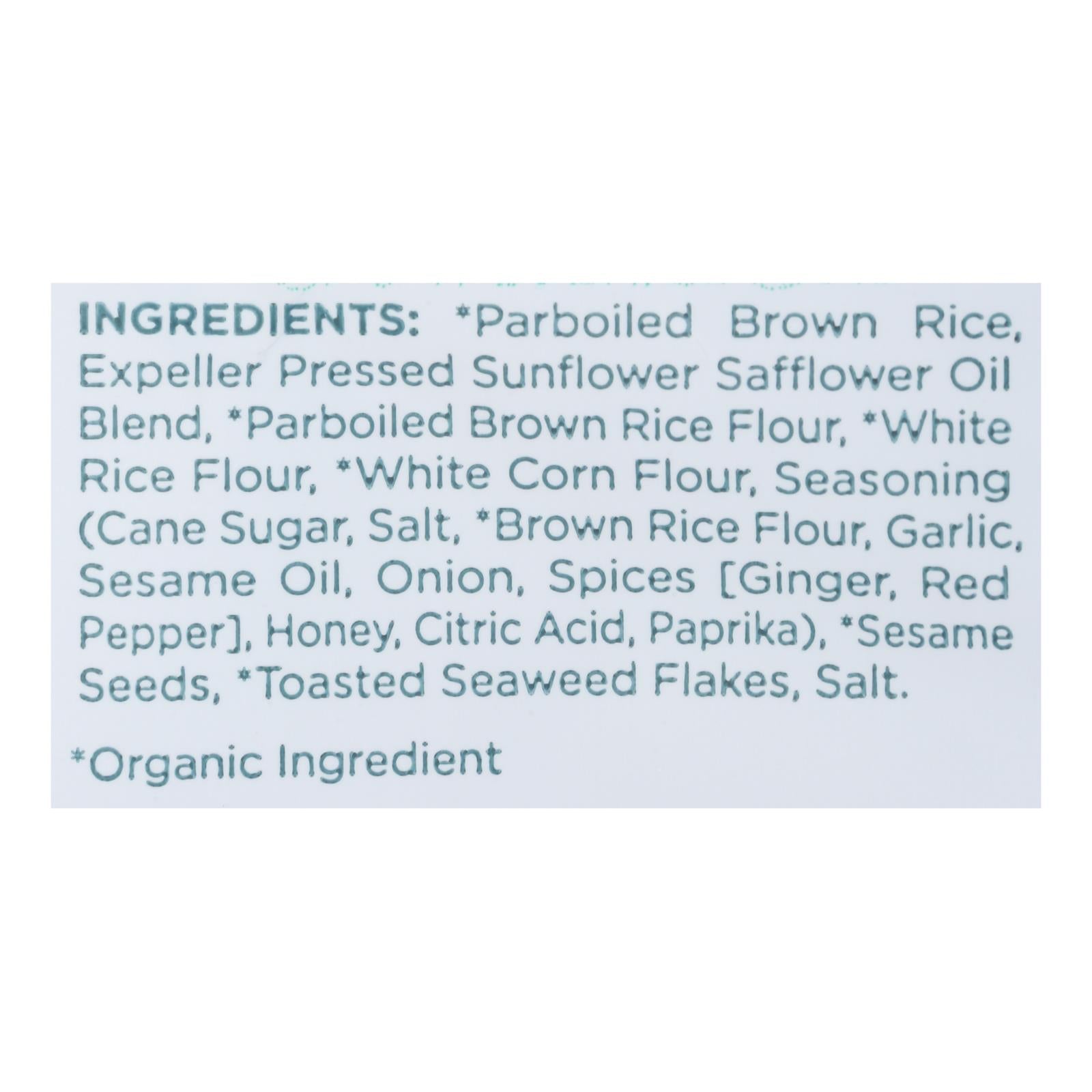 ingredients : rice flour (*brown rice flour, *white rice flour);sunflower oil;corn flour;navy bean;brown rice;seasoning (cane sugar, salt, rice flour, garlic powder, sesame oil, onion powder, ginger, red pepper, dried parsley, paprika, citric acid);chia seeds;pea protein;nori seaweed