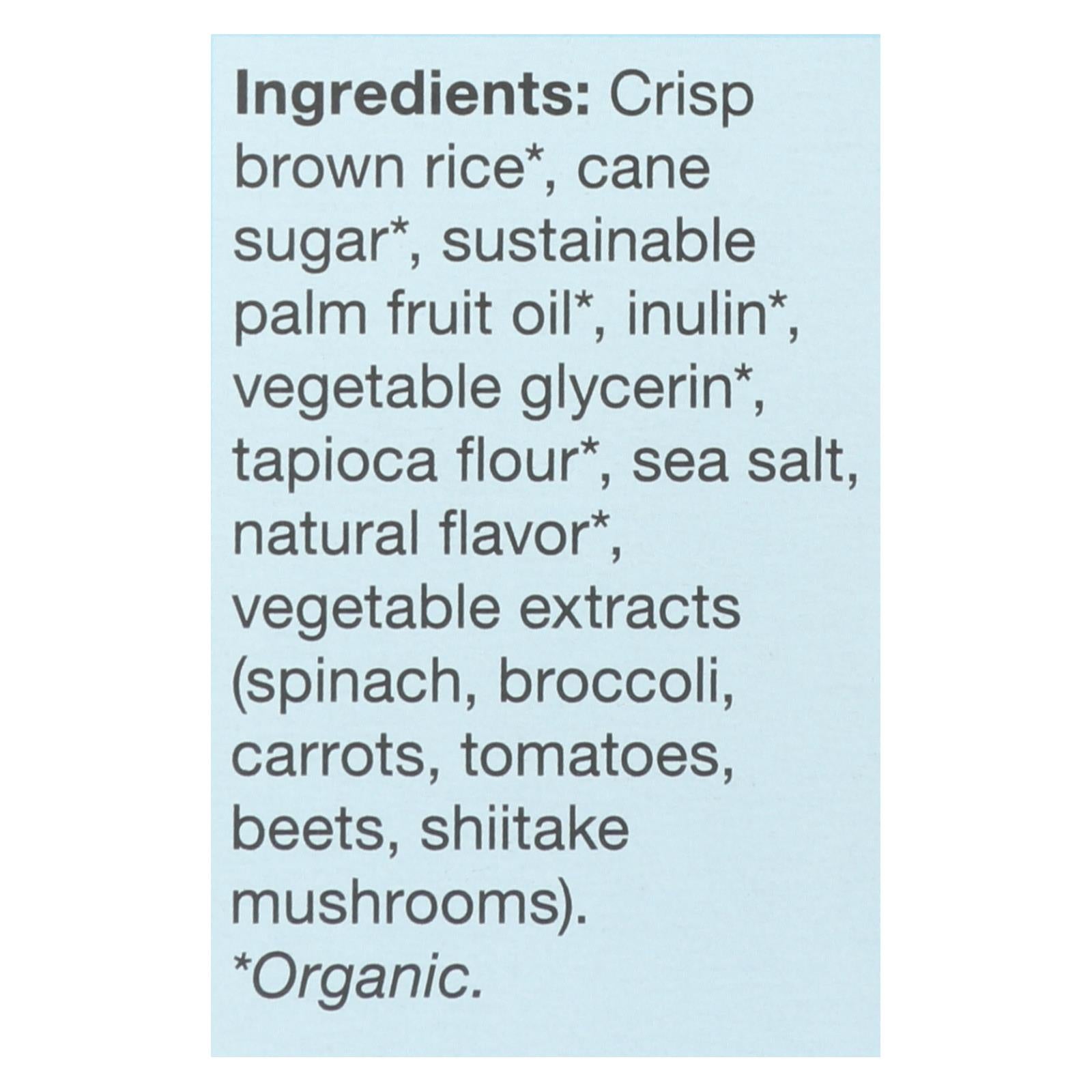 ingredients : crisp brown rice;cane sugar;sustainable palm fruit oil;inulin;vegetable glycerin;tapioca flour;sea salt;natural flavor;vegetable extracts;spinach;broccoli;carrots;tomatoes;beets;shiitake mushrooms