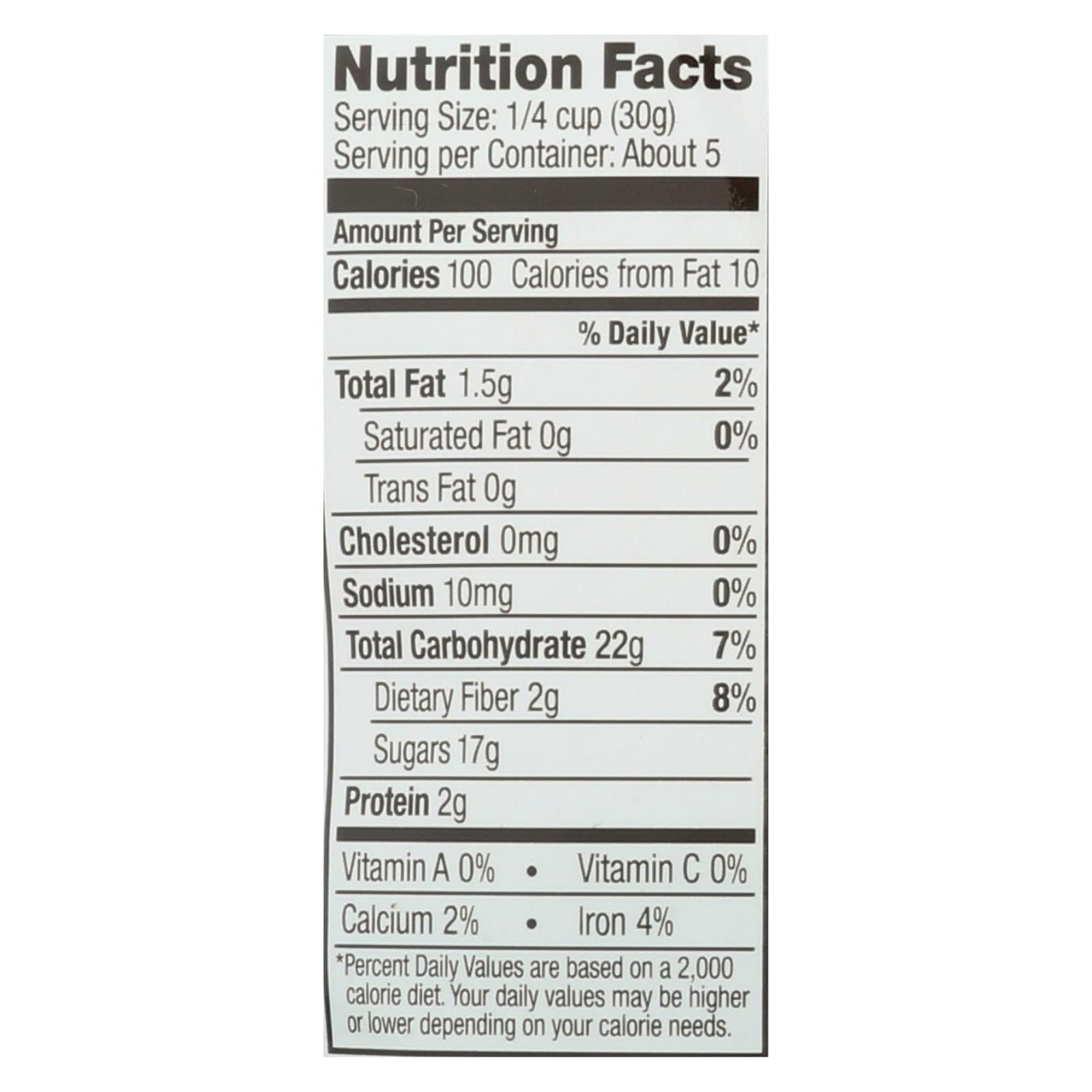 ingredients : organic cranberries;organic raisins;organic tart cherries;organic dry roasted pepita seeds;organic blueberries;organic goji berries;organic apple juice concentrate;organic sunflower oil