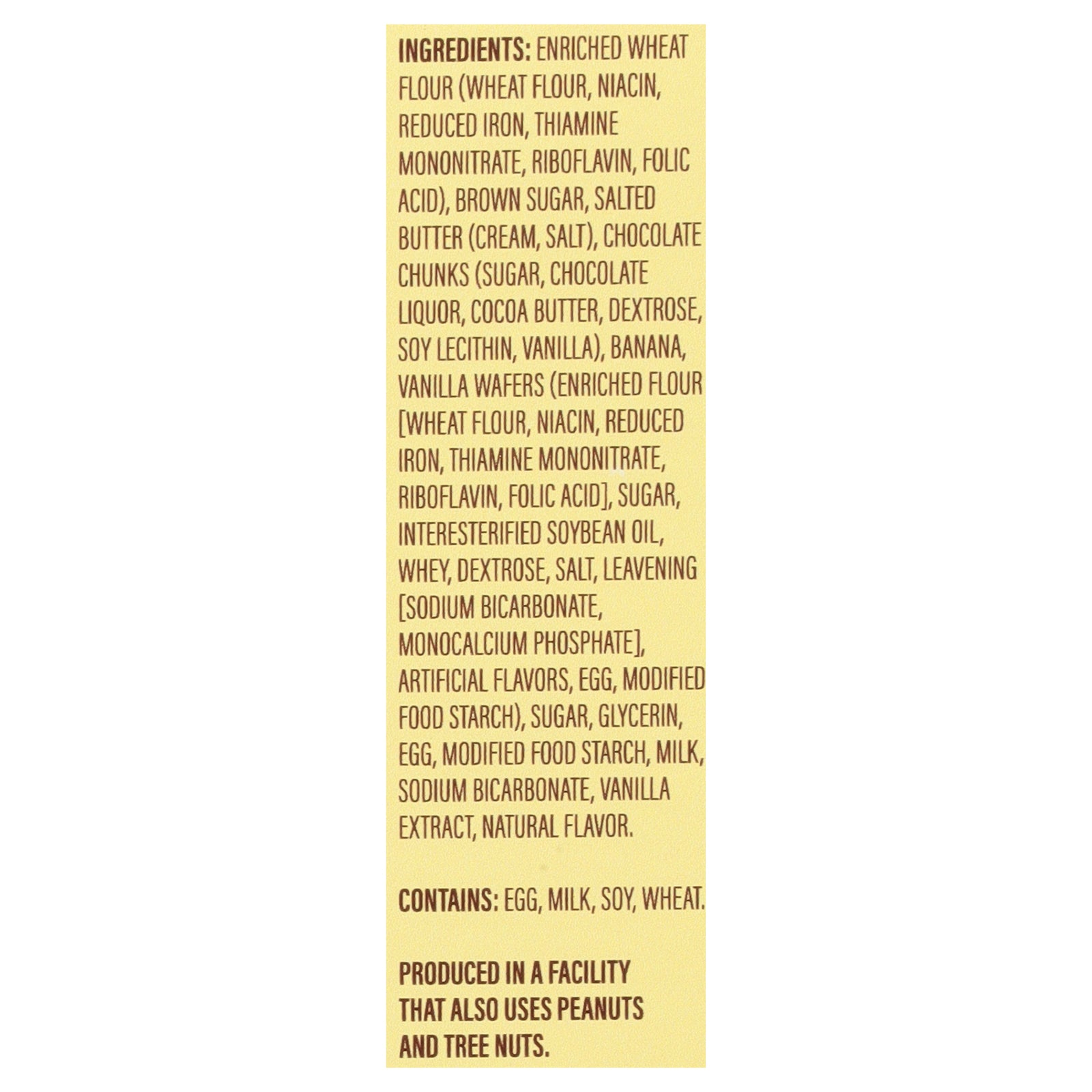 ingredients : enriched wheat flour (wheat flour, niacin, reduced iron, thiamine mononitrate, riboflavin, folic acid);brown sugar;salted butter (cream, salt);chocolate chunks (sugar, chocolate liquor, cocoa butter, dextrose, soy lecithin, vanilla);banana;wafers (enriched flour [wheat flour, niacin, reduced iron, thiamine mononitrate, riboflavin, folic acid], sugar, interesterified soybean oil, whey, dextrose, salt, leavening [sodium bicarbonate, monocalcium phosphate], artificial flavors, egg, modified food st