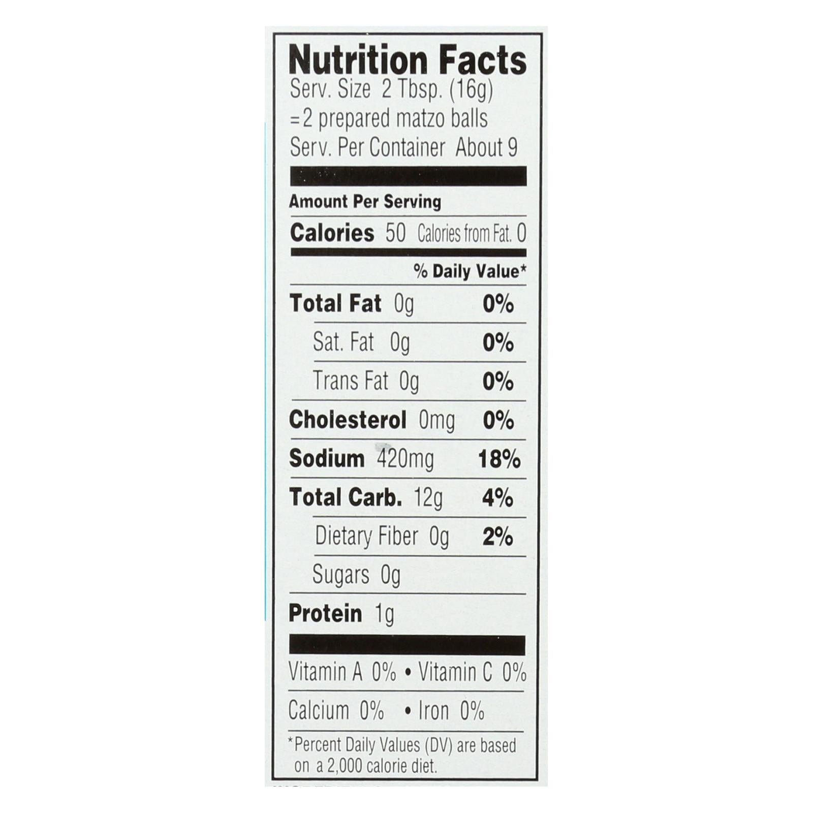 Quality since 1888. Kosher for passover and all year round. 30% less sodium than our original mix (per serving: this product: 420 mg sodium; our original product: 600 mg sodium). L'chaim! to life! all natural. 0 g trans fat per serving. No msg. Healthy body. Healthy spirit. This product is sold by weight not by volume. For great recipes and more visit www.manischewitz.com. Printed on recycled paperboard. Matzo balls are a delicious treat that taste great in chicken soup or as a side dish. Enjoy all of our matzo ball, and matzo ball & soup products throughout the year. For great recipes, product information and more, log on to: www.manischewitz.com. Www.manischewitz.com. This product is lactose free and vegetarian. Product of usa.