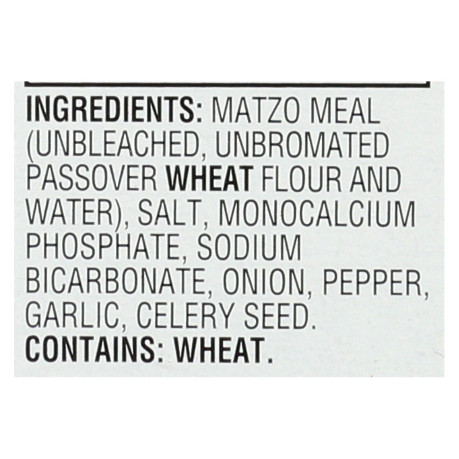 ingredients : matzo meal;unbleached;unbromated passover wheat flour and water;salt;monocalcium phosphate;sodium bicarbonate;onion;pepper;garlic;celery seed