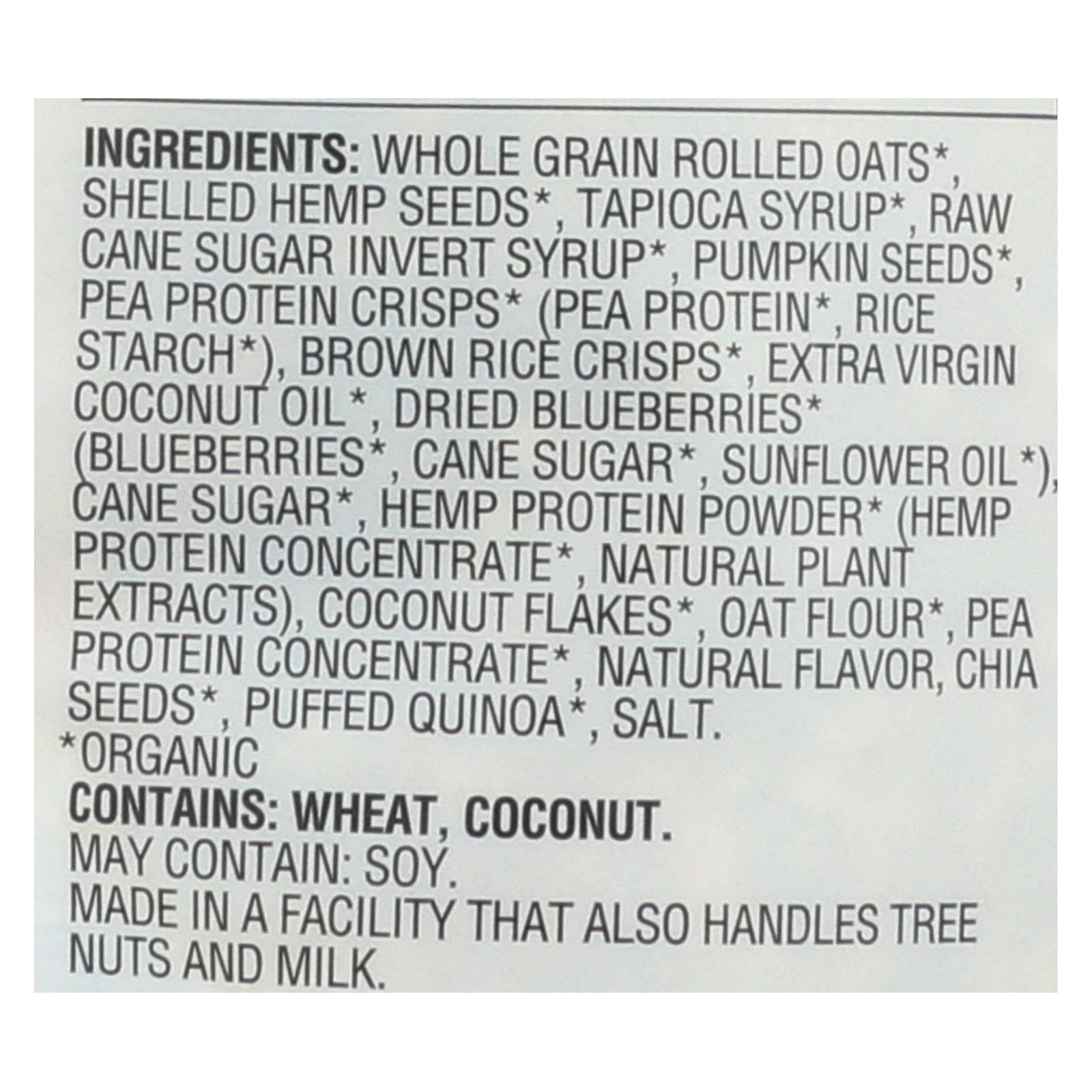 ingredients : whole grain rolled oats†;shelled hemp seeds†;raw cane sugar invert syrup†;tapioca syrup†;brown rice crisps†;pumpkin seeds†;pea protein crisps† (pea protein†, rice starch†);coconut oil†;cane sugar†;dried blueberries† (blueberries†, cane sugar†, sunflower oil†);dried coconut†;pea protein†;oat flour†;natural flavor;chia seeds†;puffed quinoa†;salt