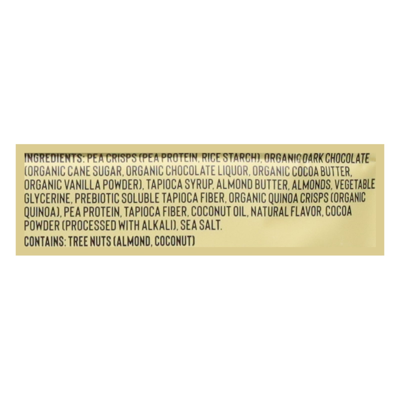 ingredients : pea crisps (pea protein, rice starch);organic dark chocolate (organic cane sugar, organic chocolate liquor, organic cocoa butter, organic vanilla powder);tapioca syrup;almond butter;almonds;vegetable glycerine;prebiotic soluble tapioca fiber;quinoa crisps (quinoa);pea protein;tapioca fiber;coconut oil;cocoa powder (processed with alkali);sea salt;natural flavor