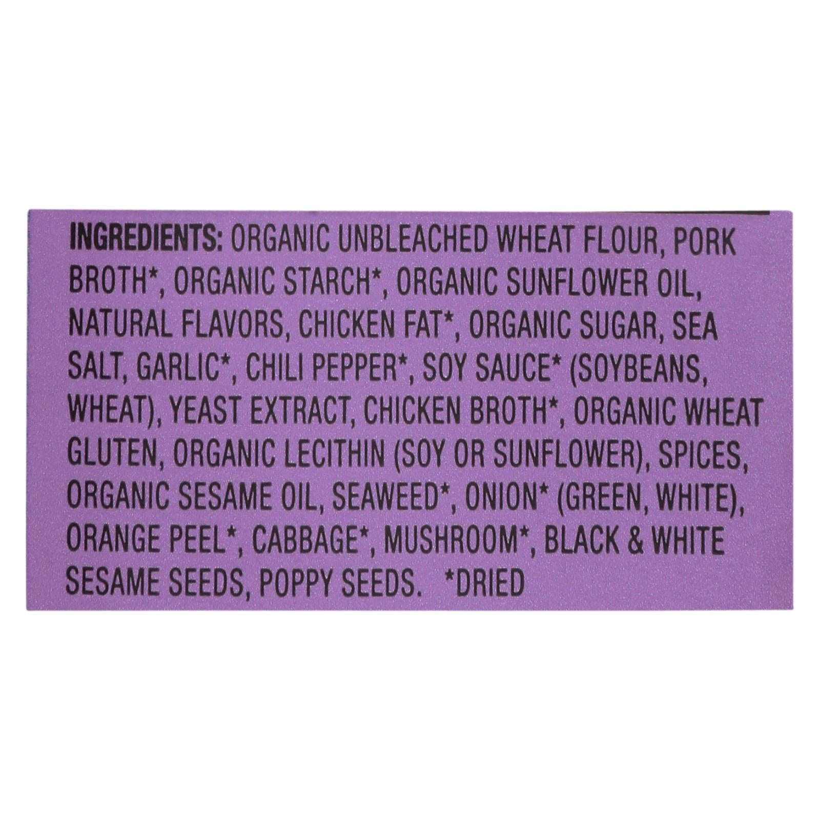 ingredients : organic unbleached wheat flour;pork broth;organic starch;organic sunflower oil;natural flavors;chicken fat;organic sugar;sea salt;garlic;chili pepper;soy sauce;soybeans;wheat;yeast extract;chicken broth;organic wheat gluten;organic lecithin;soy or sunflower;spices;organic sesame oil;seaweed;oninon;green;white;orange peel;cabbage;mushroom;black & white sesame seeds;poppy seeds