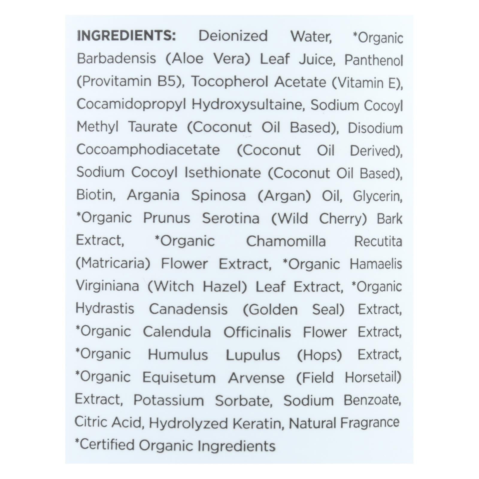 ingredients : deionized water;organic barbadensis;aloe vera;leaf juice;panthenol;provitamin b5;tocopherol acetate;vitamin e;cocamidopropyl hydroxysultaine;sodium cocoyl methyl taurate;coconut oil based;disodium cocoamphodiacetate;coconut oil derived;sodium cocoyl isethionate;biotin;argania spinosa;argan;oil;glycerin;organic prunus serotina;wild cherry;bark extract;organic chamomilla recutita;matricaria;flower extract;organic hamaelis virginiana;witch hazel;leaf extract;organic hydrastis canadensis;golden seal