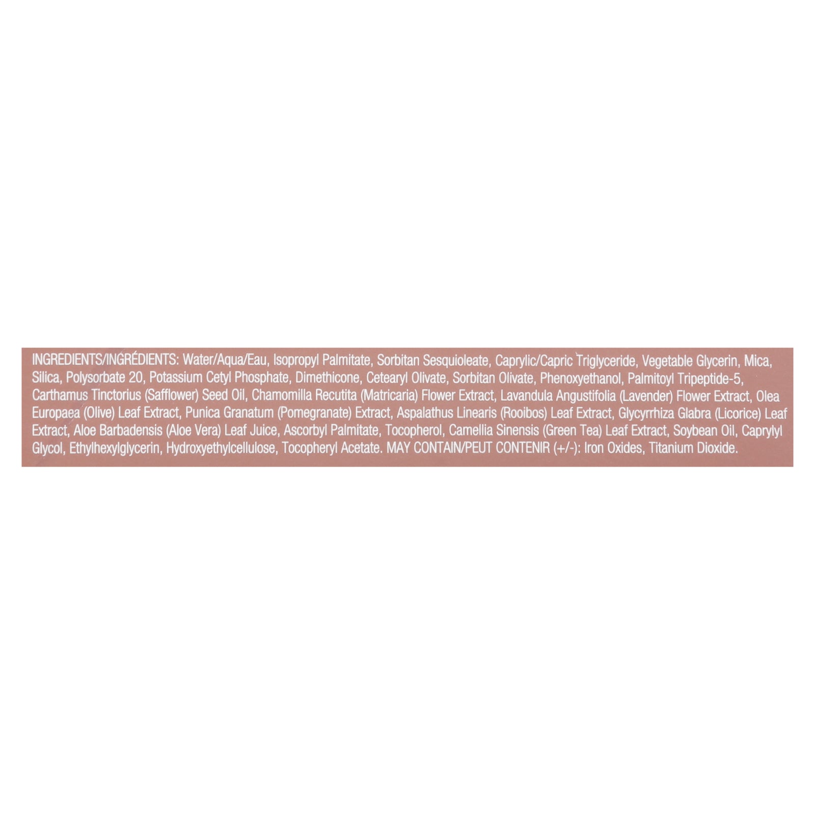 ingredients : water/aqua;isopropyl palmitate;sorbitan sesquioleate;caprylic/capric triglyceride;vegetable glycerin;mica;silica;polysorbate 20;potassium cetyl phosphate;dimethicone;cetearyl olivate;sorbitan olivate;phenoxyethanol;palmitoyl tripeptide-5;carthamus tinctorius (safflower) seed oil;chamomilla recutita (matricaria) flower extract;lavandula angustifolia (lavender) flower extract;olea europaea (olive) leaf extract;punica granatum (pomegranate) extract;aspalathus linearis (rooibos) leaf extract;glycyrr