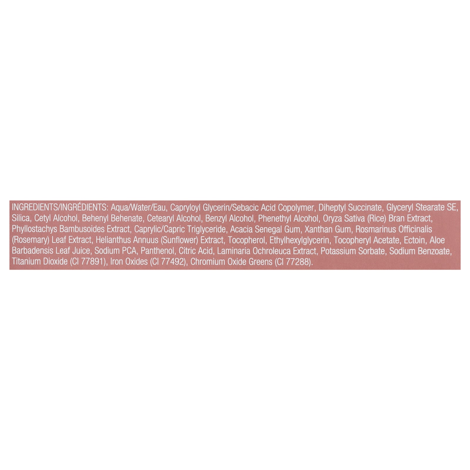 ingredients : aqua/water/eau;capryloyl glycerin/sebacic acid copolymer;diheptyl succinate;glyceryl stearate se;silica;cetyl alcohol;behenyl behenate;cetearyl alcohol;benzyl alcohol;phenethyl alcohol;oryza sativa (rice) bran extract;phyllostachys bambusoides extract;caprylic/capric triglyceride;acacia senegal gum;xanthan gum;rosmarinus officinalis (rosemary) leaf extract;helianthus annuus (sunflower) extract;tocopherol;ethylhexylglycerin;tocopheryl acetate;ectoin;aloe barbadensis leaf juice;sodium pca;pantheno