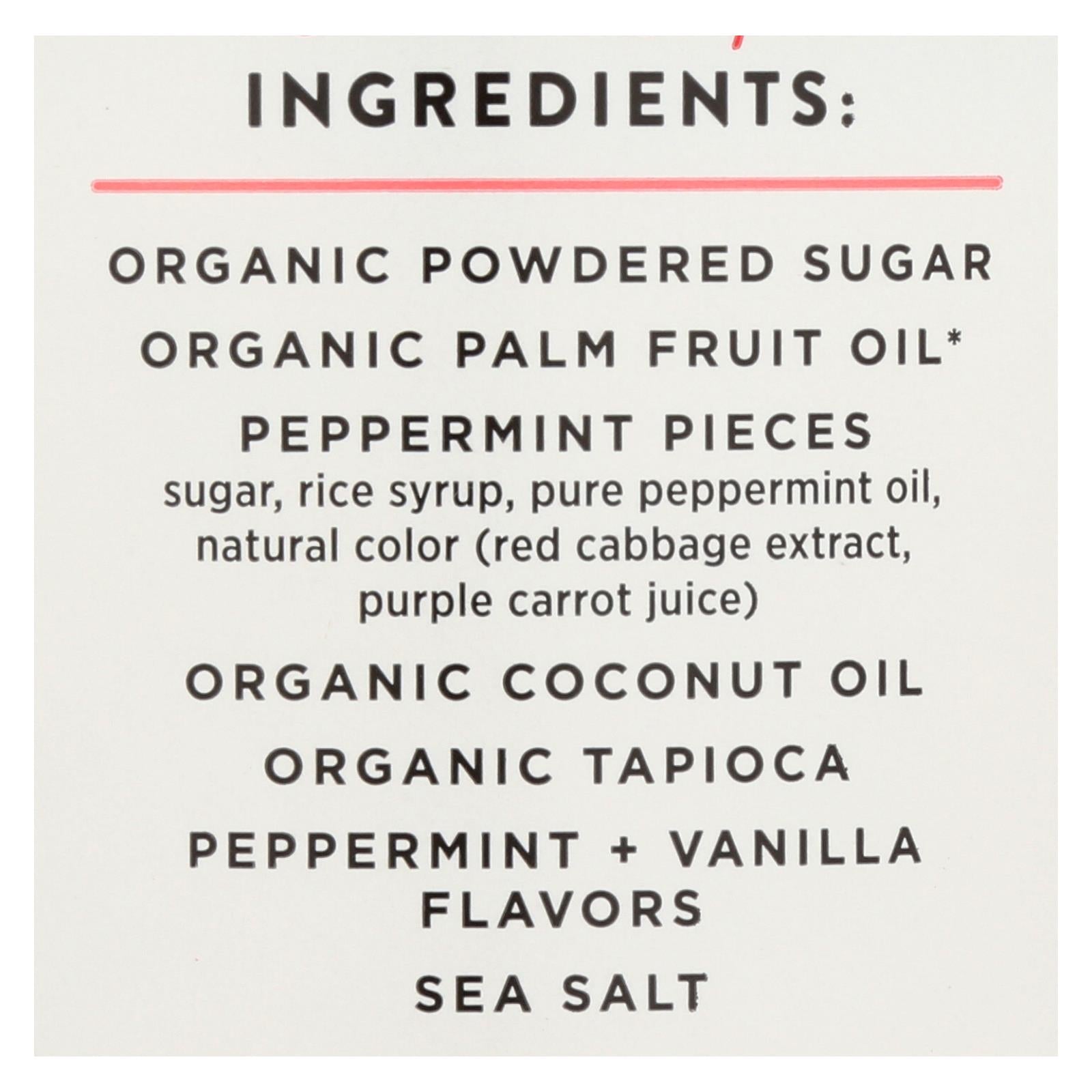 ingredients : organic powdered sugar organic palm fruit oil* peppermint pieces sugar;rice syrup;pure peppermint oil;natural color;red cabbage extract;purple carrot juice;organic coconut oil organic tapioca peppermint + vanilla flavors sea salt