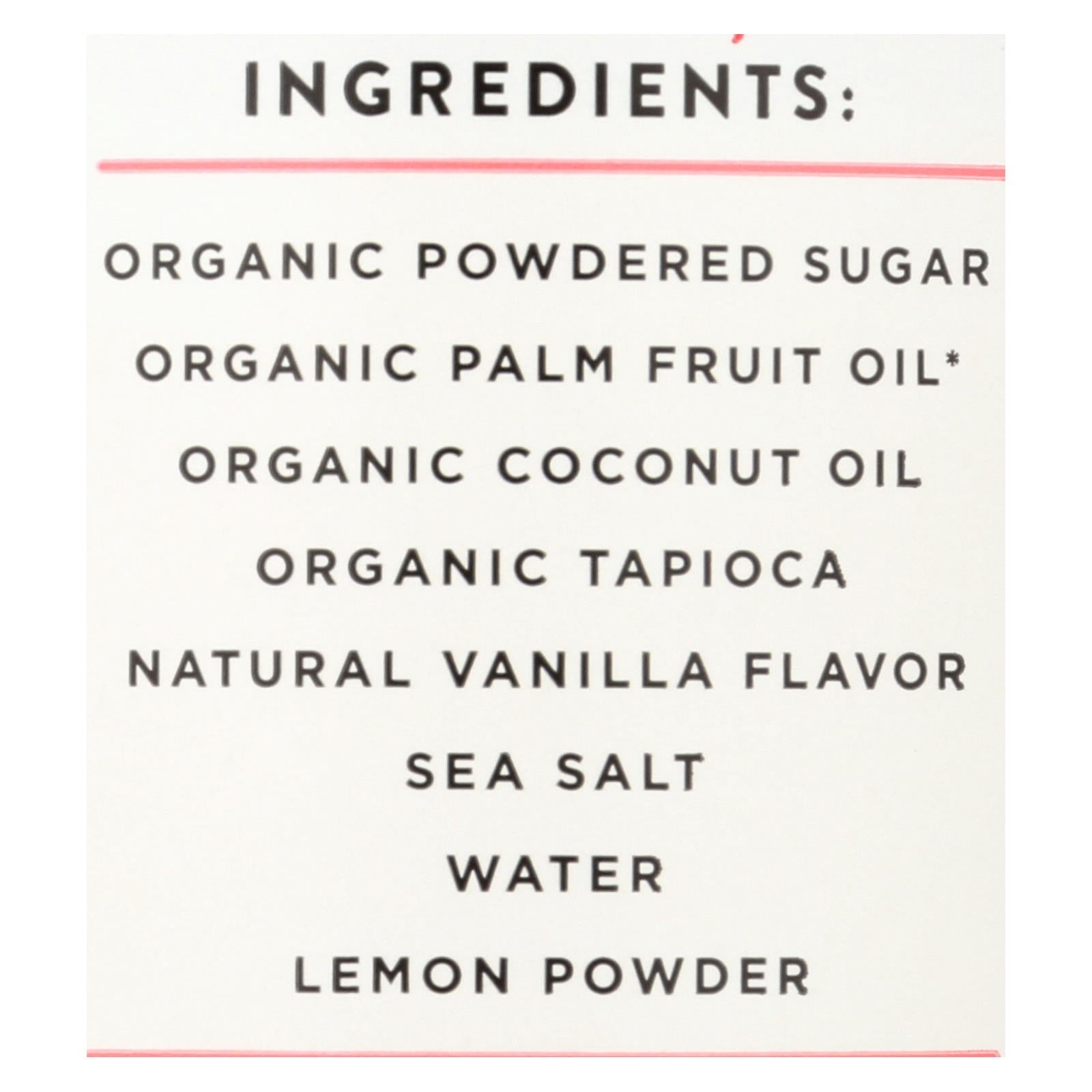ingredients : organic powdered sugar organic palm fruit oil* organic coconut oil organic tapioca natural vanilla flavor sea salt water lemon powder