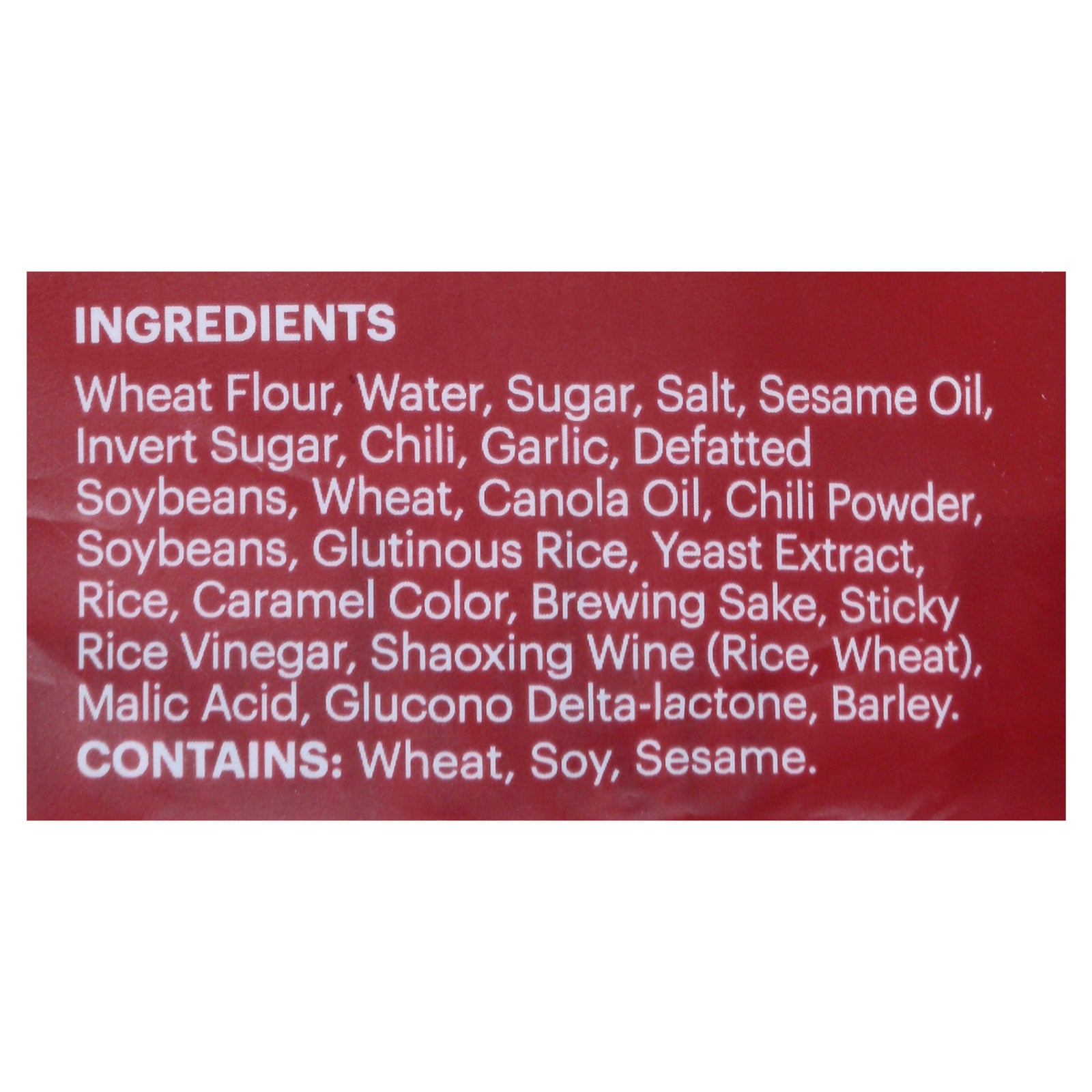 ingredients : wheat flour;water;sugar;salt;sesame oil;invert sugar;chili;garlic;defatted soybeans;wheat;canola oil;chili powder;soybeans;glutinous rice;yeast extract;rice;caramel color;brewing sake;sticky rice vinegar;shaoxing wine (rice, wheat);malic acid;glucono delta-lactone;barley