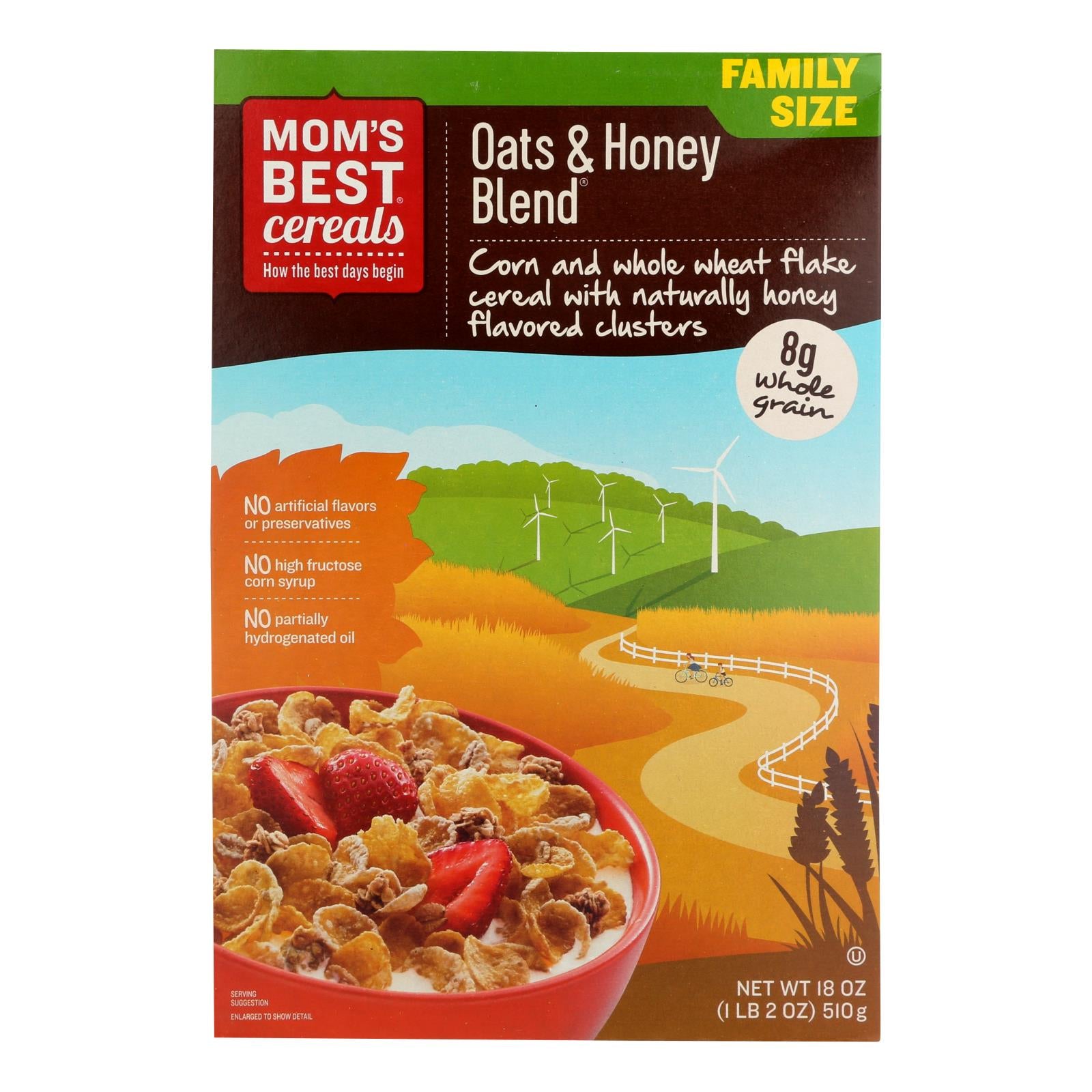 Mom's best cereals oats & honey blend is a lightly sweetened corn and whole wheat flake cereal with whole grain oat clusters that provide 10 g. Of whole grain per serving. Our cereal is made with real honey, never artificial flavors or preservatives. Oats & honey blend comes in a 18 oz. Family size box and contains no high fructose corn syrup.
