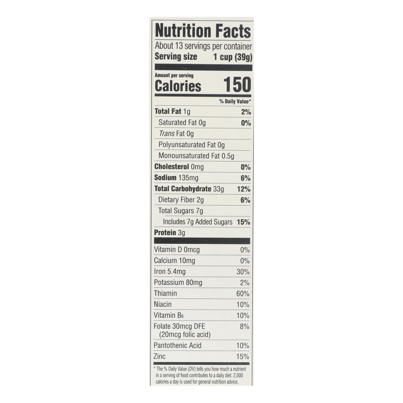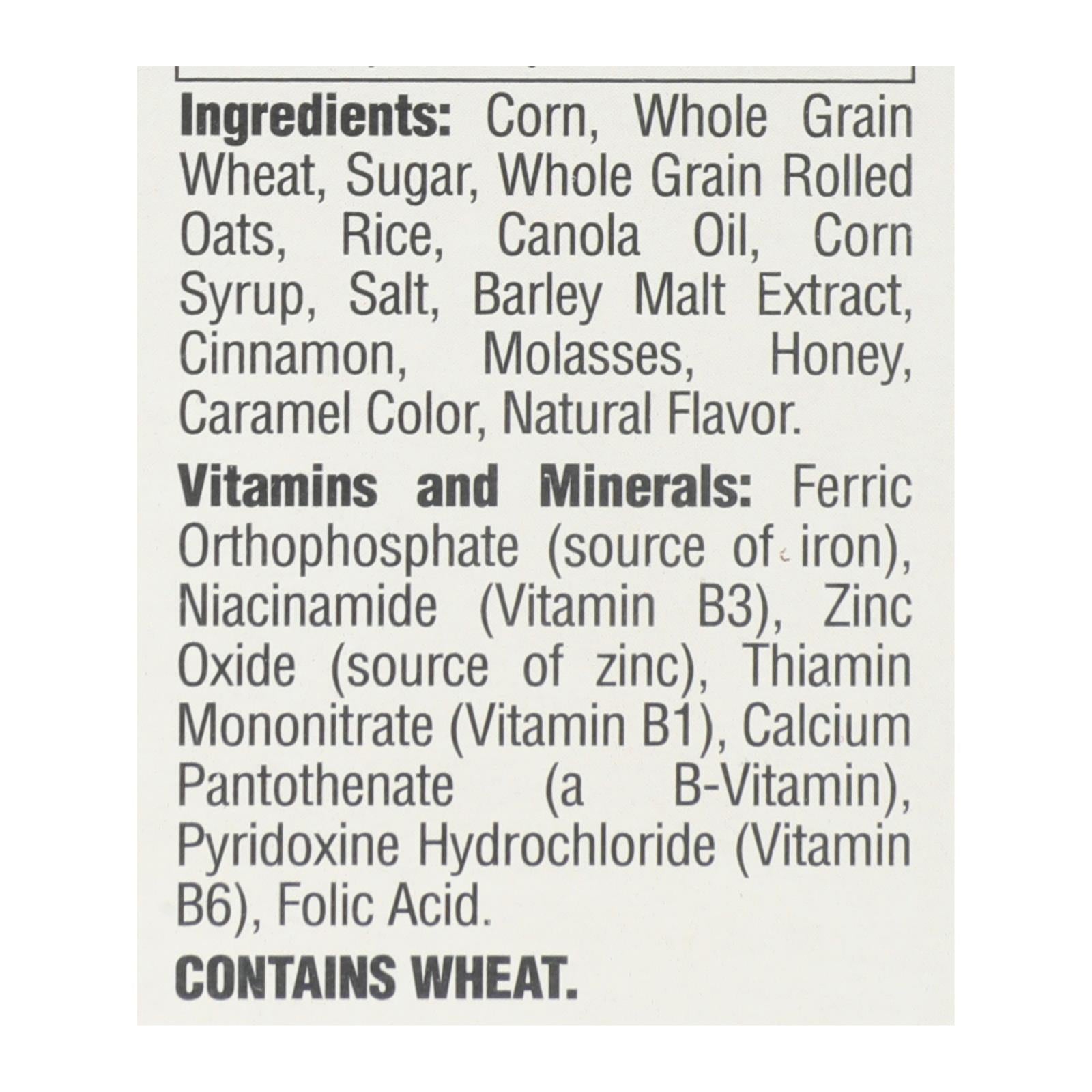 ingredients : corn;whole grain wheat;sugar;whole grain rolled oats;rice;canola oil;corn syrup;salt;barley malt extract;cinnamon;molasses;honey;caramel color;natural flavor;ferric orthophosphate;source of iron;niacinamide;vitamin b3;zinc oxide;source of zinc;thiamin mononitrate;vitamin b1;calcium pantothenate;a b-vitamin;pyridoxine hydrochloride;vitamin b6;folic acid